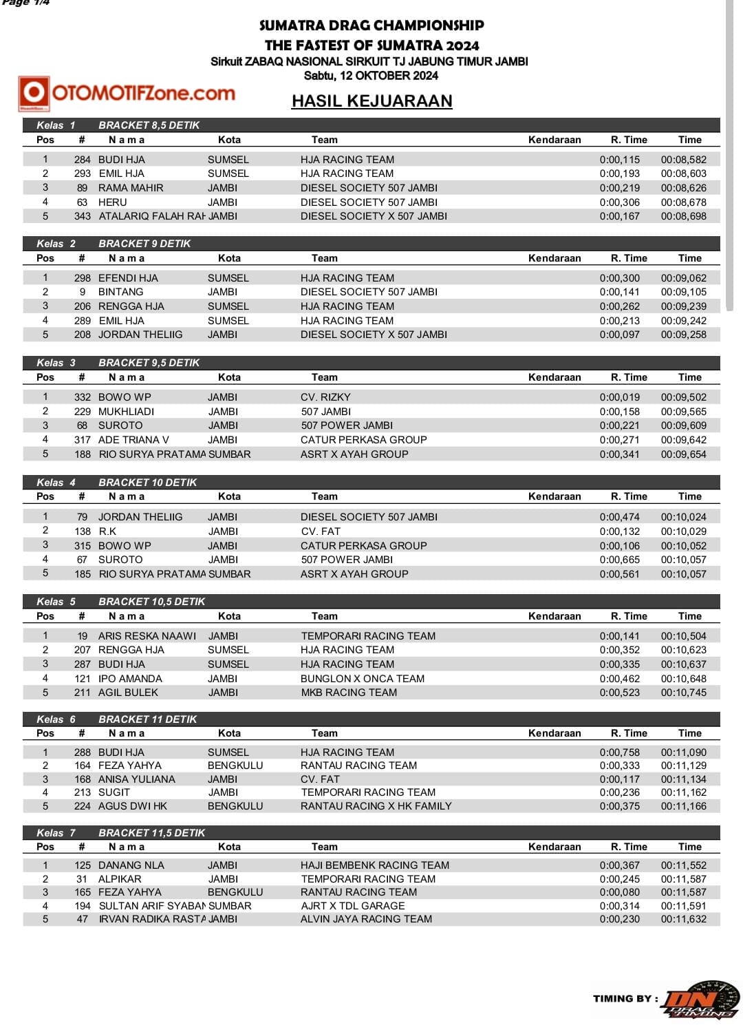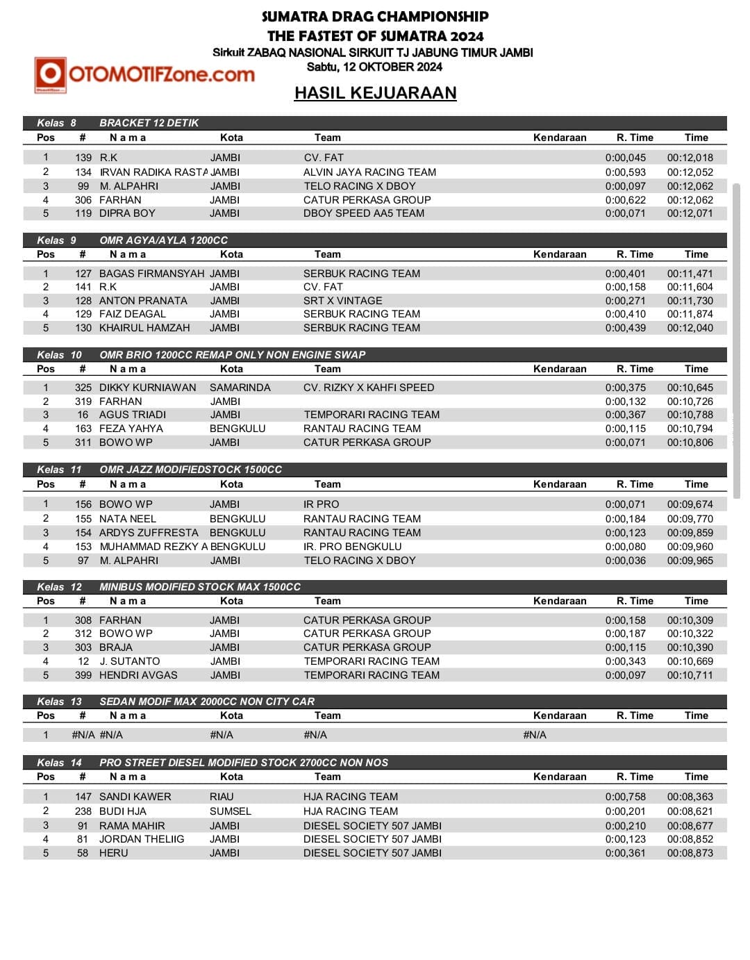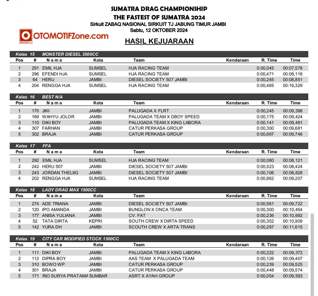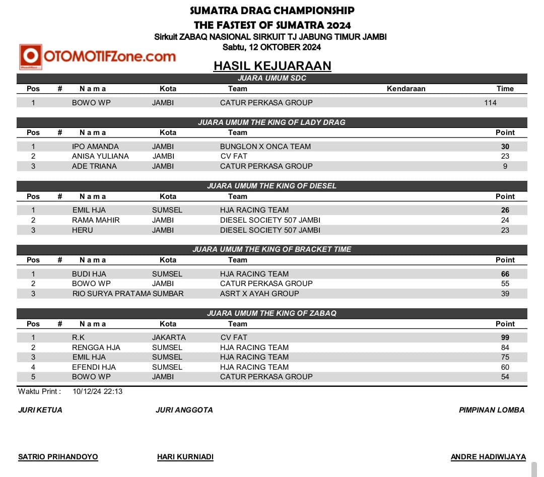 OtomotifZone.com – Jambi. Usai sudah gelaran Sumatera Drag Championship 2024 katagori Drag Race (12/10/24) di Zabaq Nasional Sirkuit, Jambi. Sengit sekali pertarungan disetiap kelasnya. Kita bisa lihat dari Raihan waktu pebalap hanya terpaut sedikit sekali. Pebalap terbaik keluar sebagai juaranya. Berikut hasil SDC Drag Race: