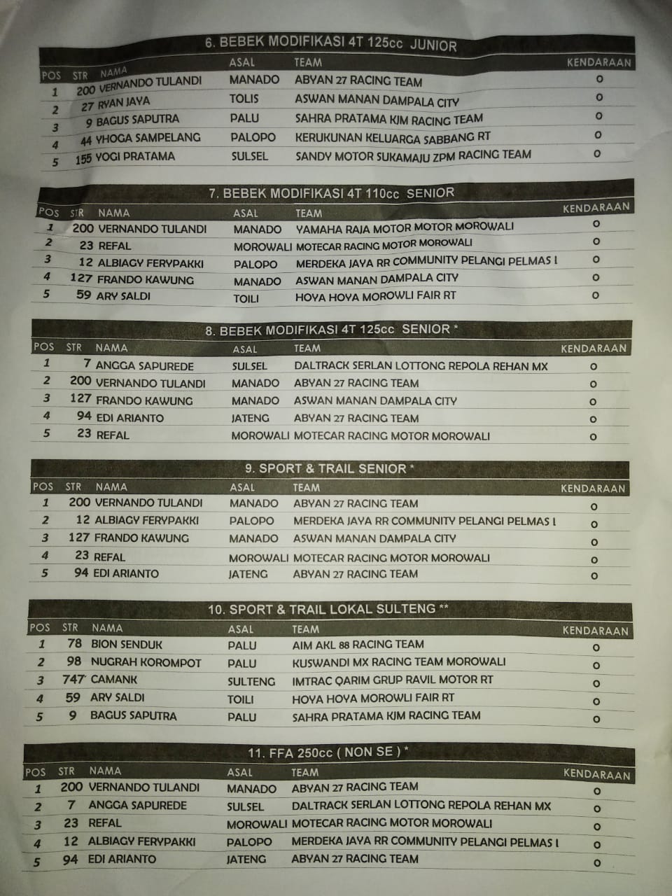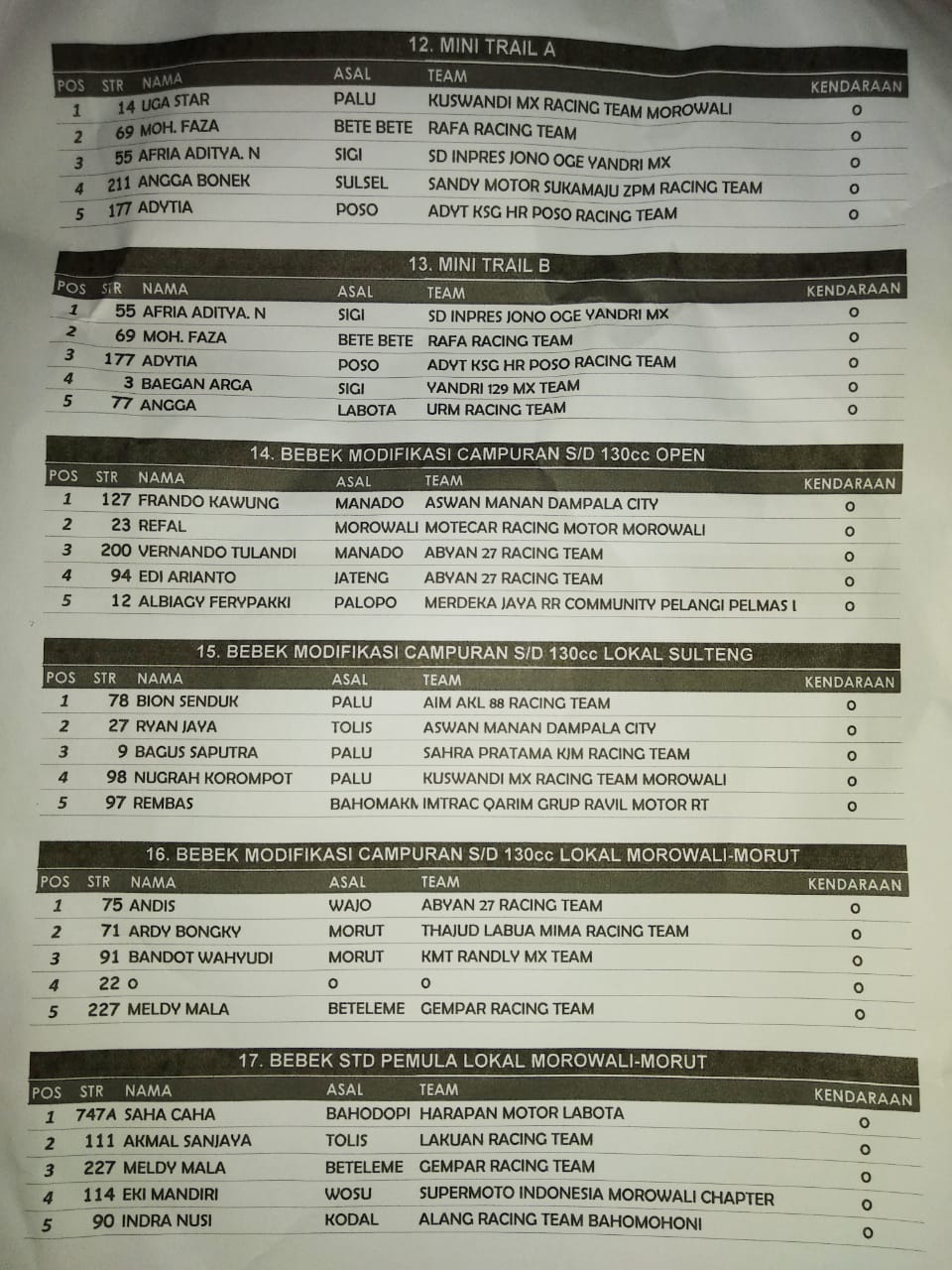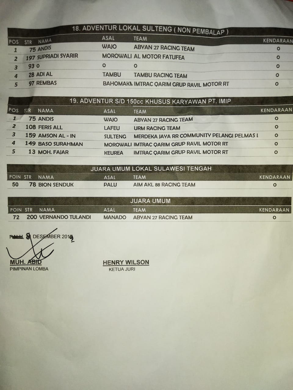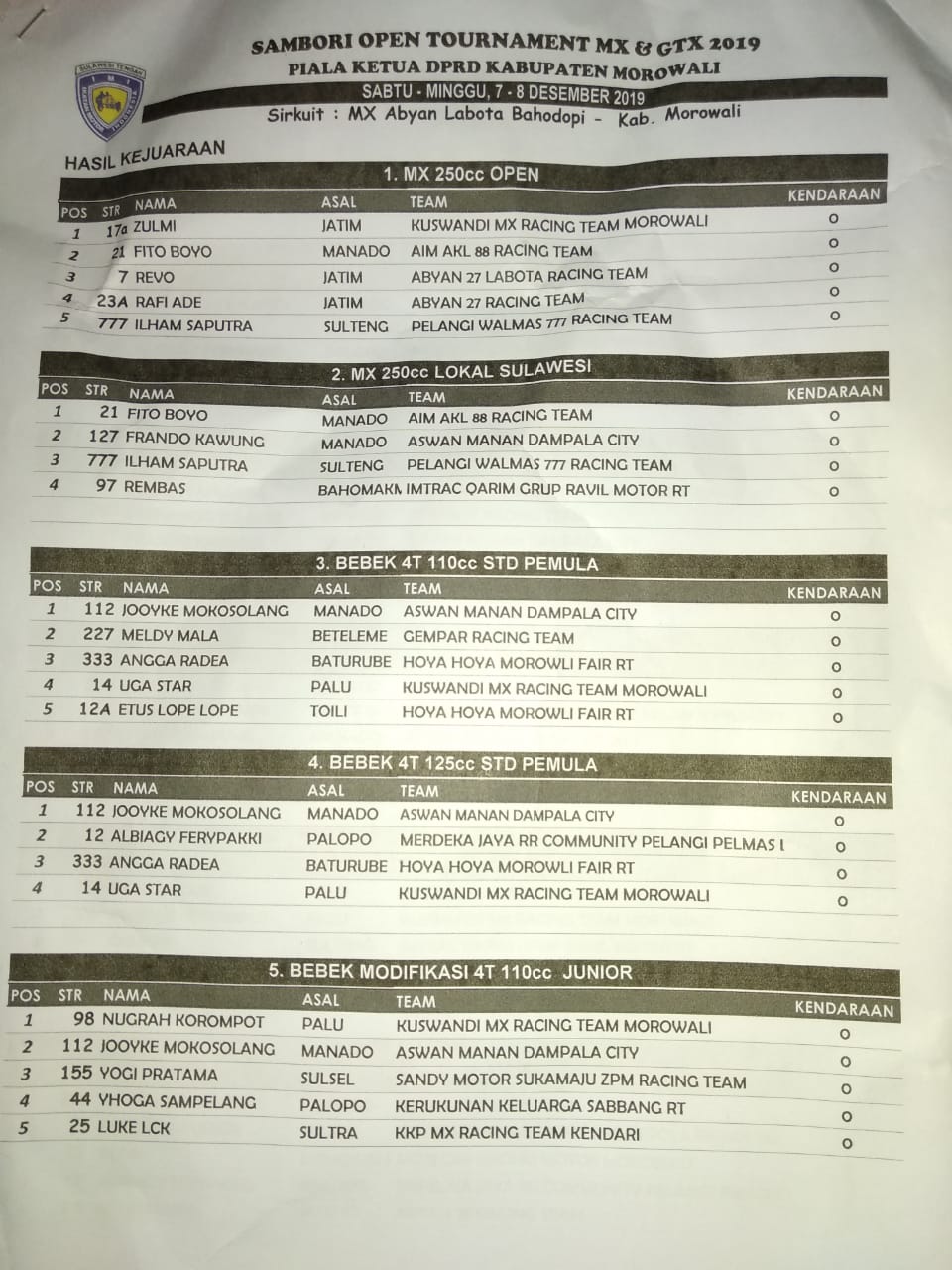 OtomotifZone.com – Sulawesi Tengah. Berikut ini adalah Hasil Lomba Sambori open Tournament MX & GTX 2019 yang berlangsung di sirkuit MX Abyan Labota Bahodopi, Kab Morowali, Sulawesi Tengah, Sabtu – Minggu (8/12).