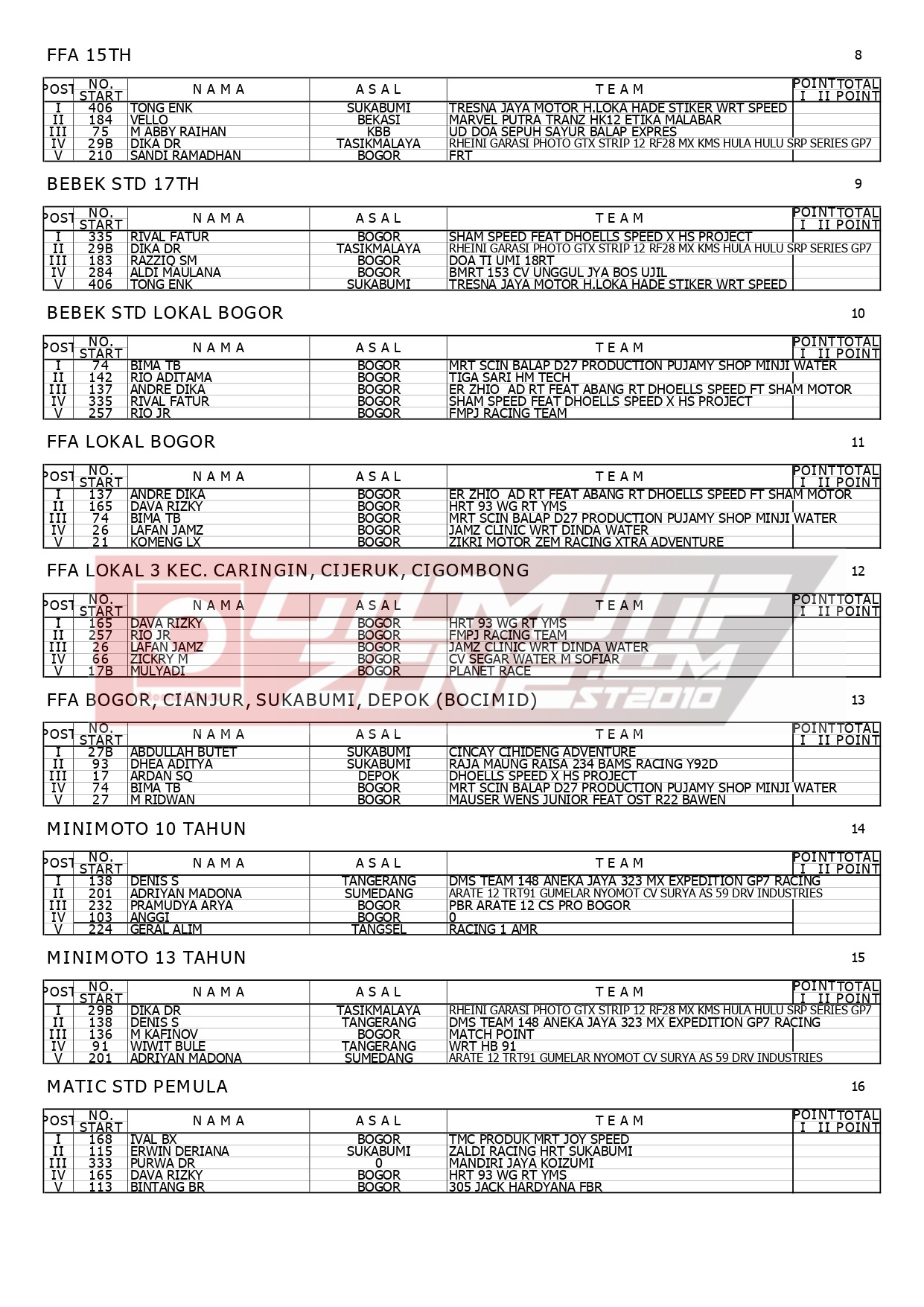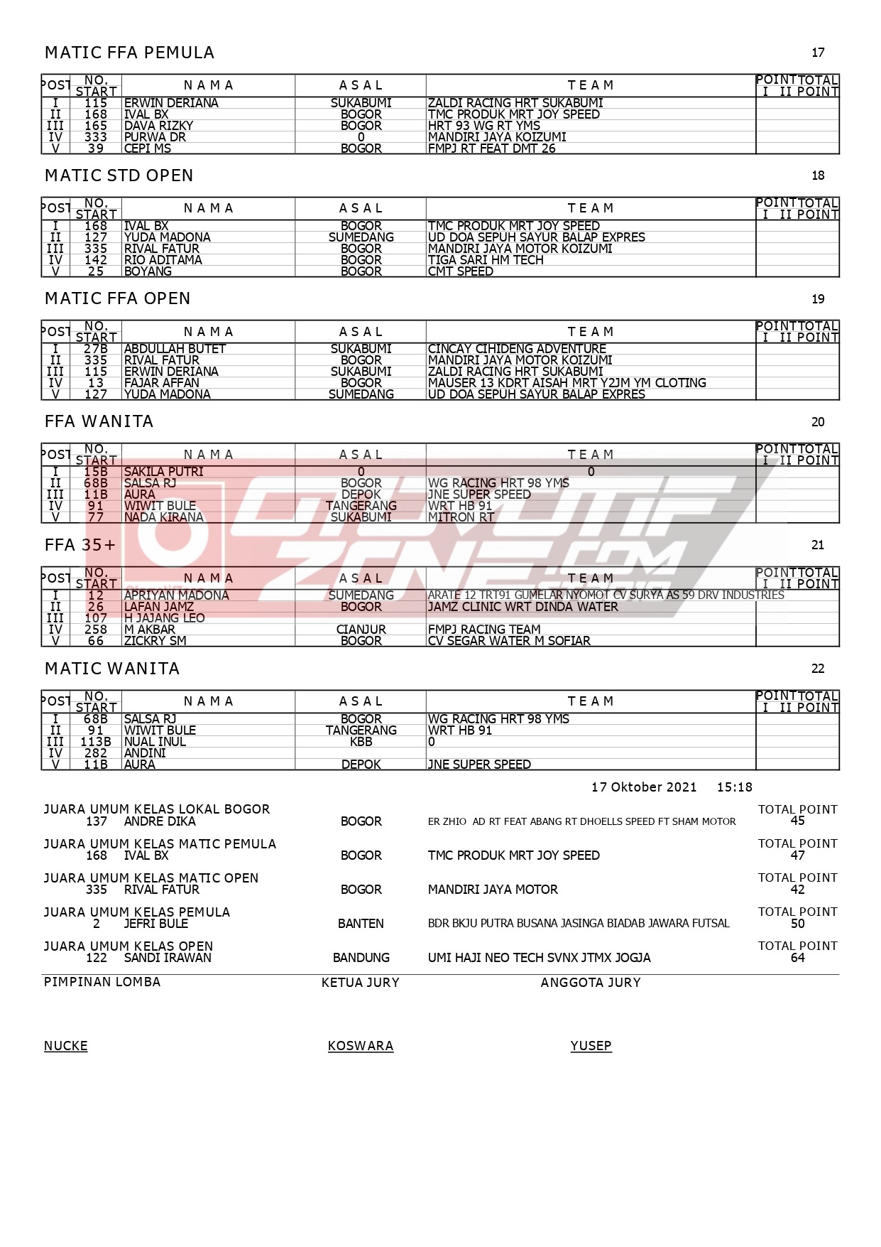Diantaranya kelas Lokal Bogor, kelas Matik Pemula, kelas Matik Open, kelas Pemula dan kelas Open.
