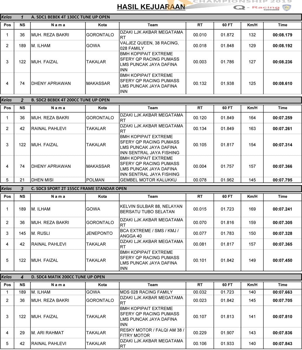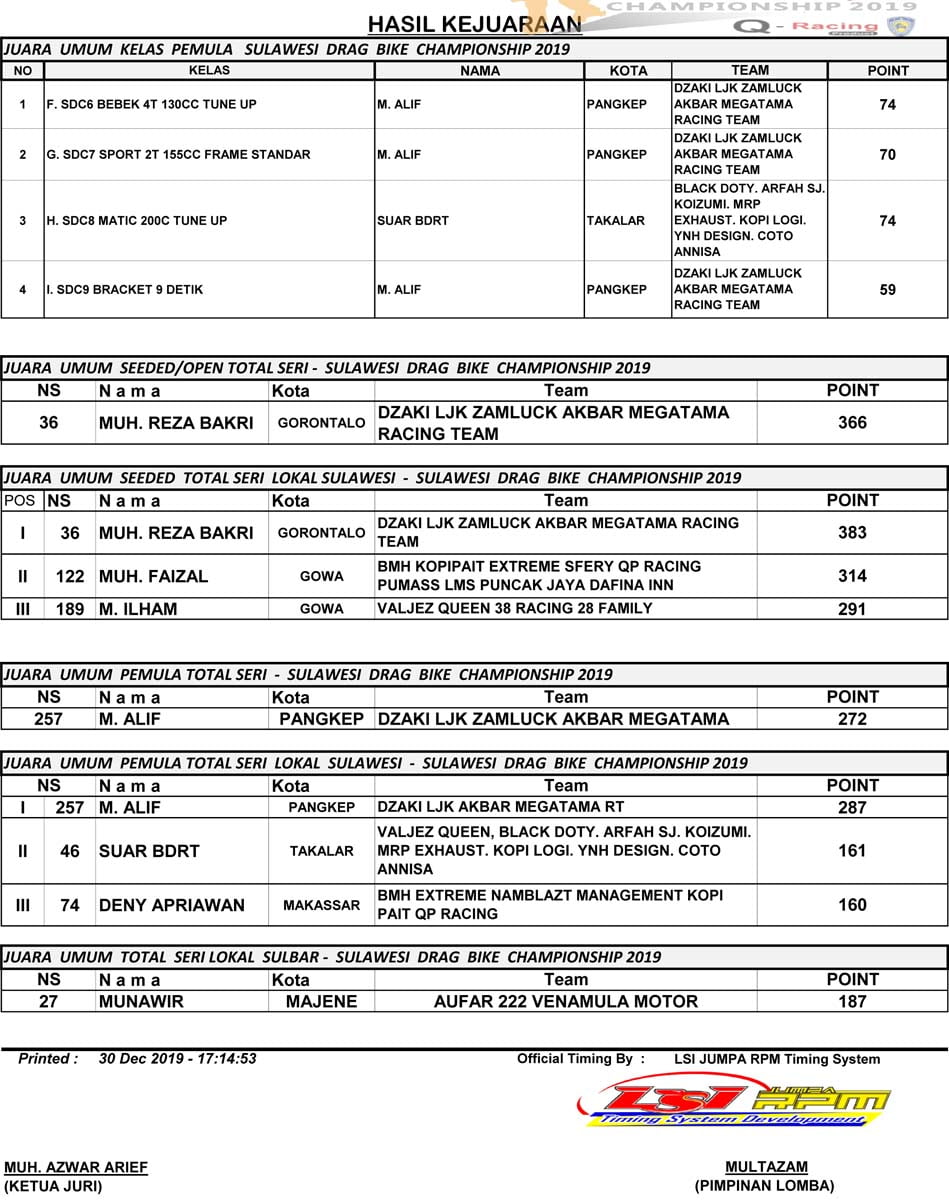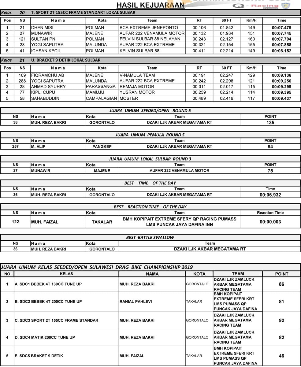 OtomotifZone.com-Mamuju, Sulbar. Berikut hasil lomba Sulawesi Drag Bike Championship Kapolresta Cup 2019 putaran 5 sekaligus Kejurda IMI Sulawesi Barat putaran 3 2019 garapan Q Racing Product yang digelar Senen, 30 Desember 2019 disirkuit Arteri Mamuju, Sulawesi Barat.