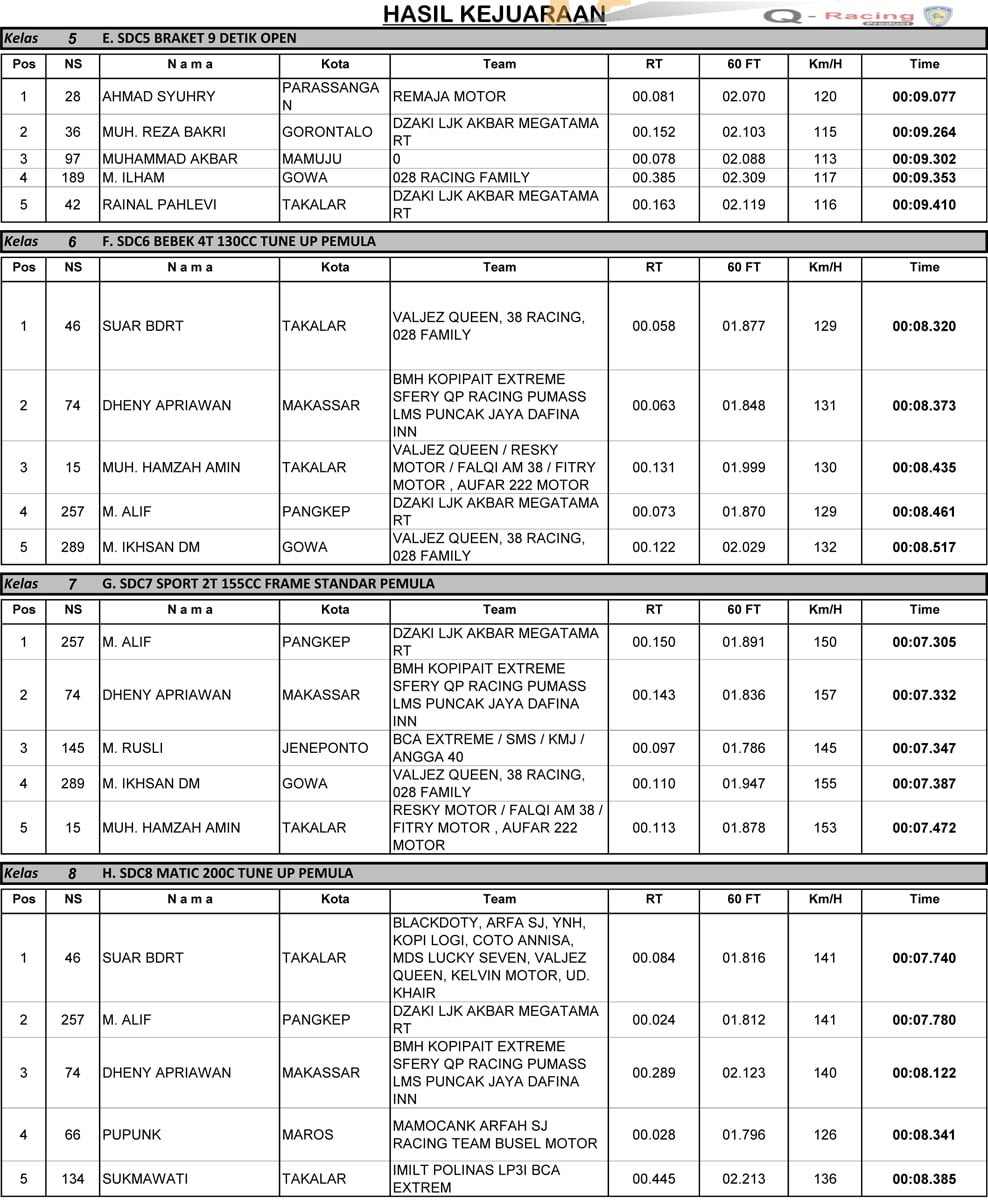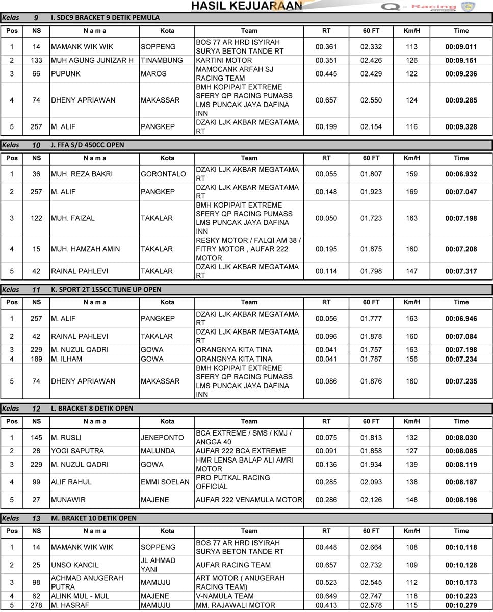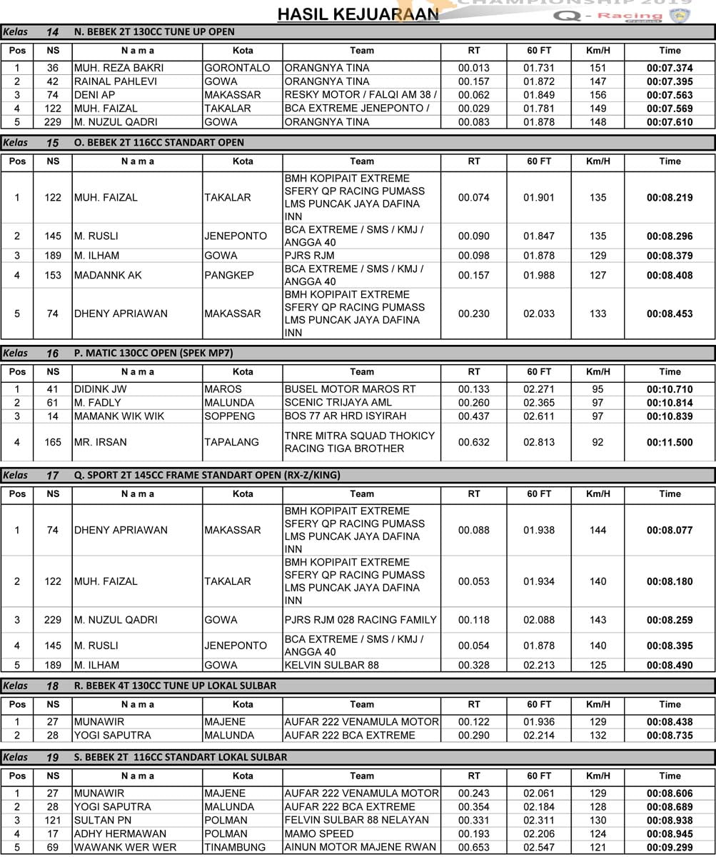 OtomotifZone.com-Mamuju, Sulbar. Berikut hasil lomba Sulawesi Drag Bike Championship Kapolresta Cup 2019 putaran 5 sekaligus Kejurda IMI Sulawesi Barat putaran 3 2019 garapan Q Racing Product yang digelar Senen, 30 Desember 2019 disirkuit Arteri Mamuju, Sulawesi Barat.