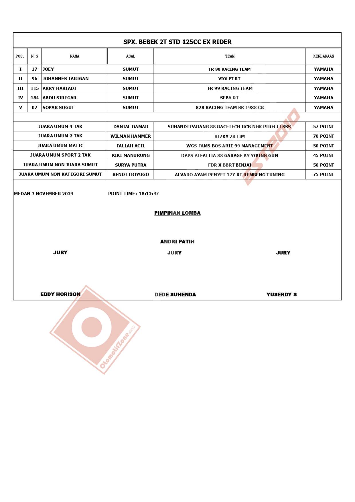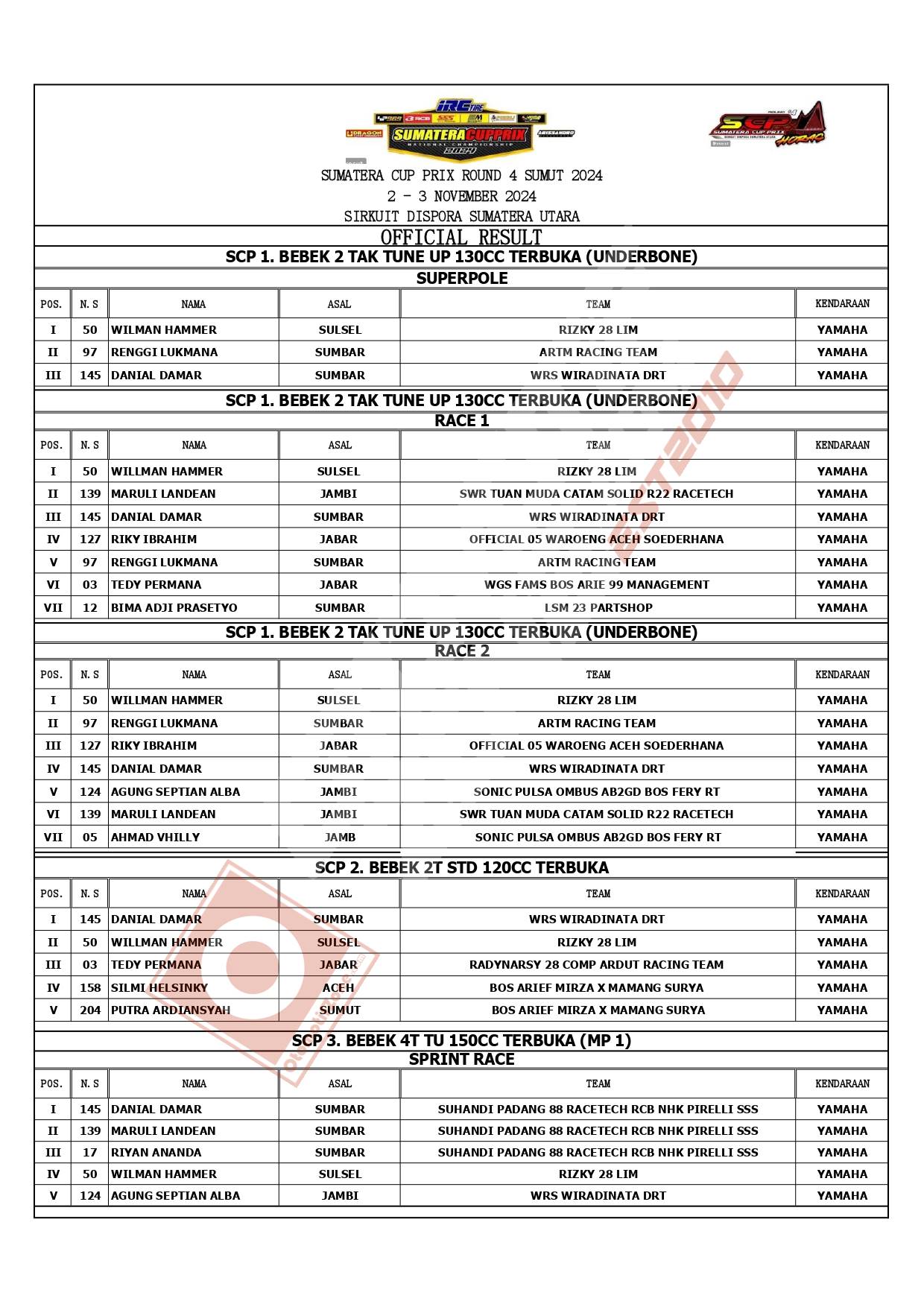 OtomotifZone.com – Medan. Usai sudah gelaran Sumatera Cup Prix putaran 4 yang berlangsung (3/11/24) di Sirkuit Dispora (Pancing) Sumatera Utara. Ramai sekali gelaran bergengsi ini saat diselenggarakan di Sirkuit yang belum lama menjadi tuan rumah PON. Dan pada gelaran SCP Medan ini, pertarungan sangat panas akan persaingan. Pebalap terbaik keluar sebagai juaranya. Berikut hasil lombanya: