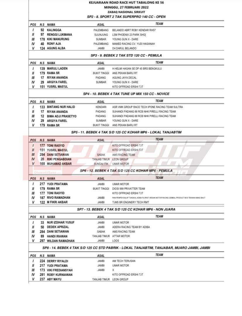 Otomotifzone.com-,Tanjab Timur-Jambi. Berikut adalah Hasil lomba dari IRC H.PUTRA969 RCB SSS SHIJIRO Sumatera Cup Prix 2022 Round 1 yang dilaksanakan di Sabak National Circuits pada Sabtu-Minggu (26/27/3/22).Di ikuti 449 Starter dari berbagai Provinsi di Sumatera dan juga Pulau Jawa yang ikut serta di Event keterlaluan ini dengan berbagai konsepnya.