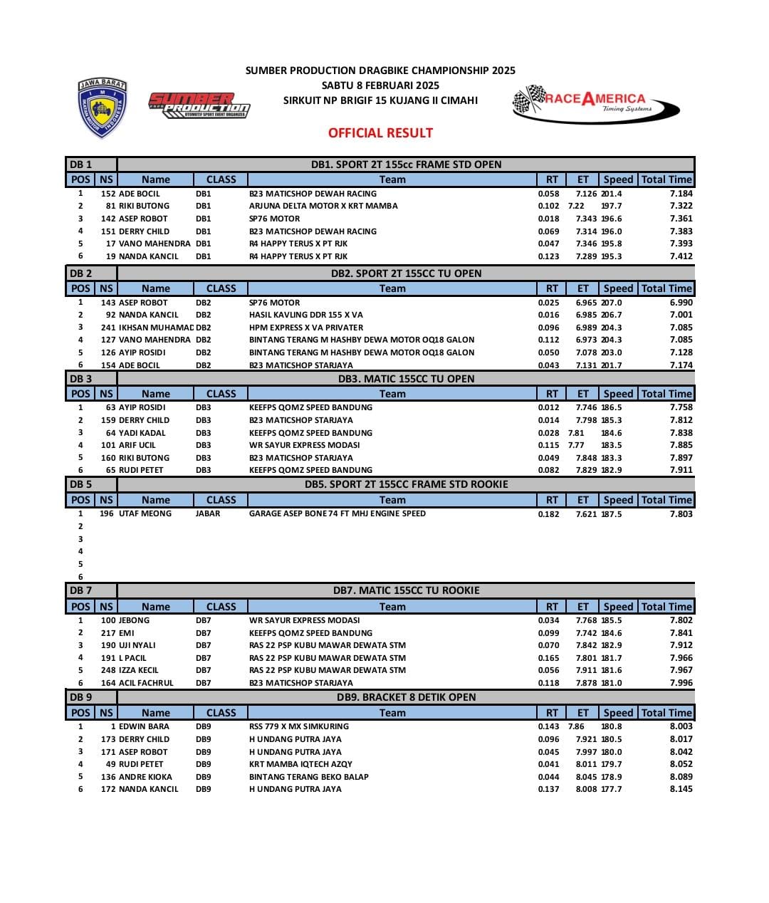 OtomotifZone.com – Bandung. Usai sudah gelaran Sumber Production Drag Bike Championship 2025 yang berlangsung (8/2/25) di Sirkuit NP Brigif Kujang II Cimahi, Bandung, Jawa Barat. Gelaran bergengsi ini diikuti banyak sekali Dragster ternama. Yang mana mereka bersaing secara sengit untuk menjadi juara. Pebalap terbaik keluar sebagai juaranya: