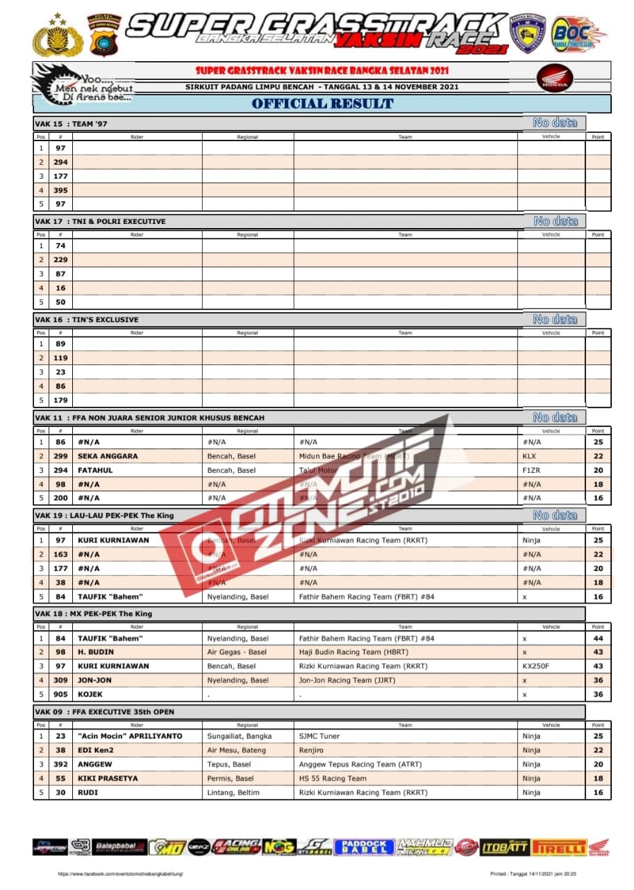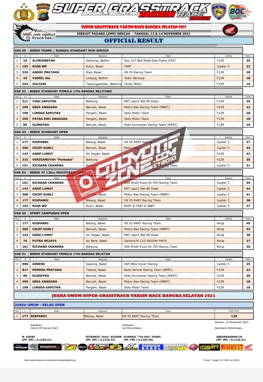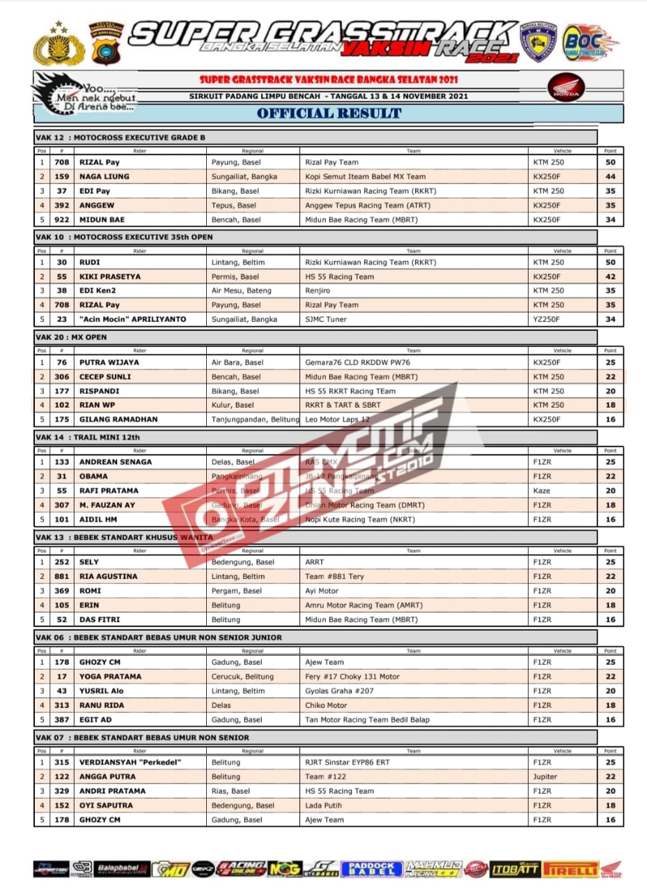 Pebalap pebalap ternama Bangka Belitung ikut serta memanaskan persaingan. Karena kita tau, tidak sedikit pebalap papan atas asal Bangka Belitung . Meski terlihat ramai, balapan ini mengikuti protokol kesehatan yang ketat. Karena semua ini dilakukan agar Indonesia bisa kembali normal. Lalu kalian ingingi tau siapa saja juara dikelas kelas yang dilombakan, berikut hasil lombanya: