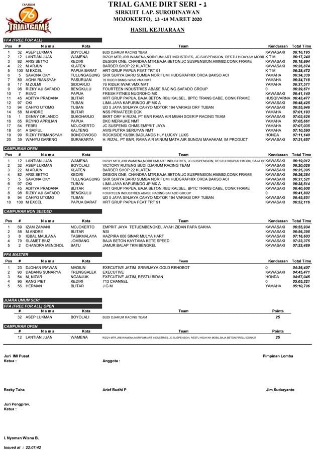 AgendaHeadlineRacing Roda 2MotocrossNewsRace Results Hasil Lomba Trial Game Dirt Seri 1 Penulis OtomotifZone.com - 16 Maret 2020 0 372 FacebookXPinterestWhatsApp OtomotifZone.com – Mojokerto. Berikut hasil lomba Trial Game Dirt seri 1 Mojokerto yang di gelar di Lapangan Surodinawan, Mojokerto, Jumat-Sabtu (13-14/3).
