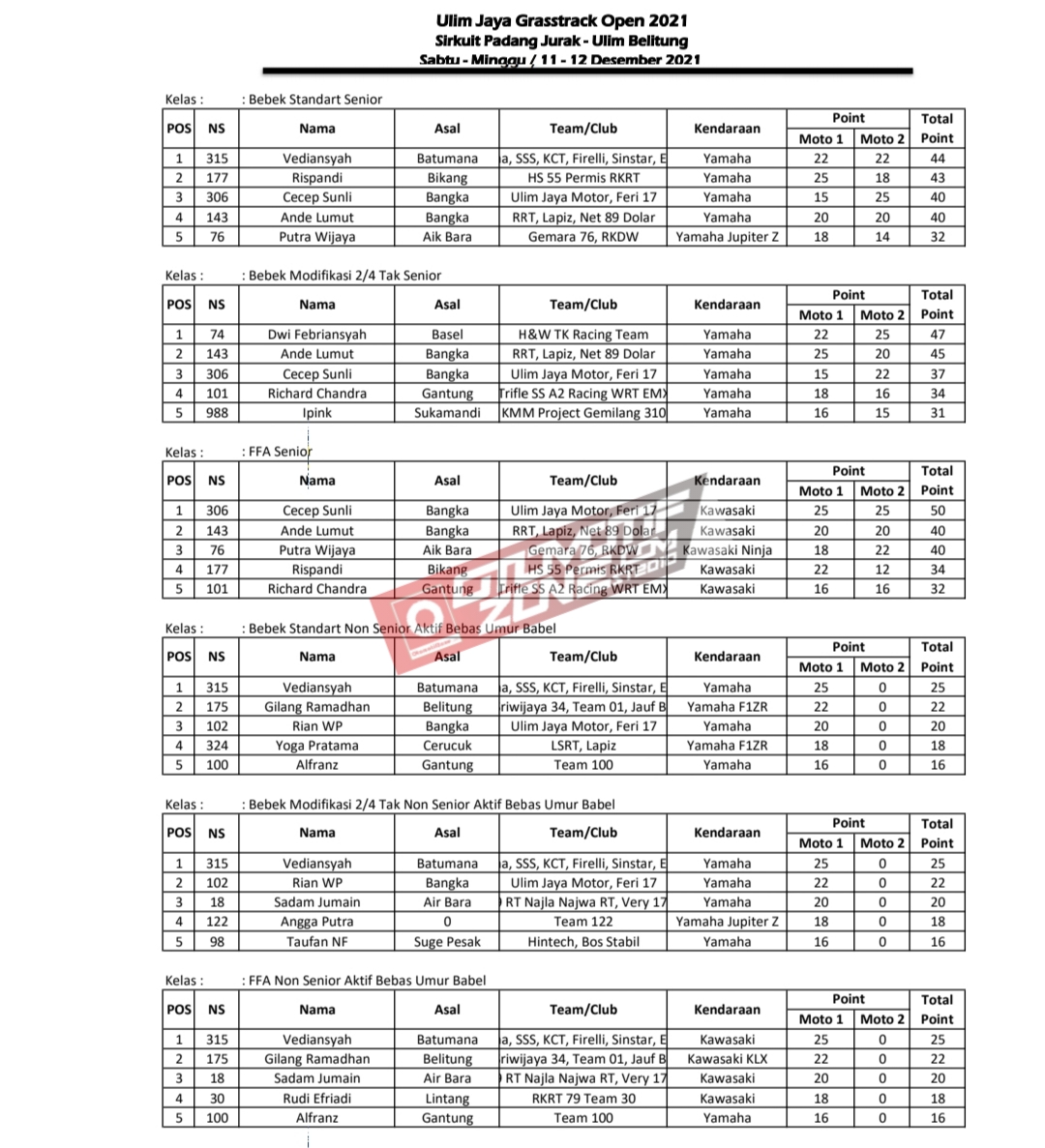 OtomotifZone.com – Bangka Belitung. Dari hasil lomba gelaran Ulim Jaya Grasstrack 2021 Open yang telah berlangsung di sirkuit Padang Jurak, Ulim, Membalong, Belitung, Bangka-Belitung, akhir pekan lalu (11-12/12) didapat tiga pemenang peraih gelar juara umum.