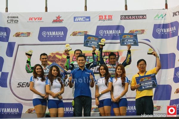OtomotifZone.com – Sentul. Balapan Yamaha Sunday Race R-Cup Seri 2 kali ini sangat mendebarkan Otozoner. Apalagi di kelas 150cc Pro dari awal lomba hingga finish gerombolan R15 ini tidak mau pecah sehingga posisi satu hingga sepuluh terus bergorombol dan silih berganti posisi, Hendriansyah yang memimpin di beberapa lap terakhir harus menelan pil pahit saat 50 meter menuju garis finish ia di salip oleh Febrianus Balank dan Nico Julian, aksi slip streaming yang di lakukan Balank cukup ampuh hingga ia berhasil juara di kelas 150cc Pro.