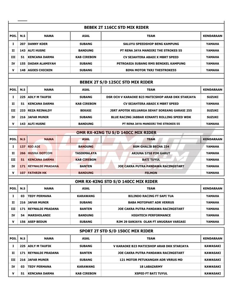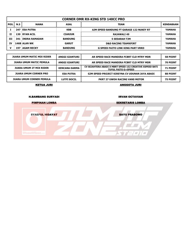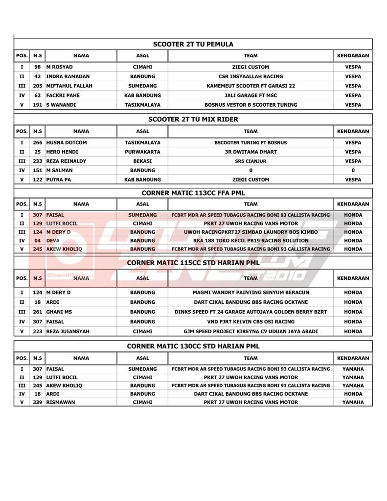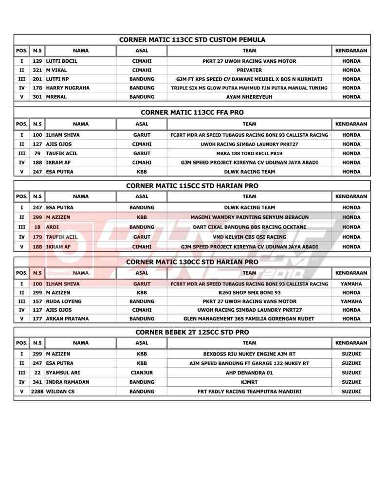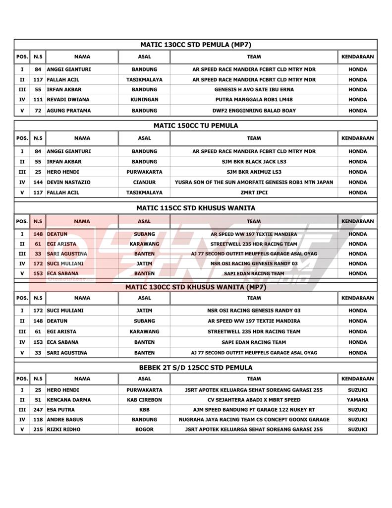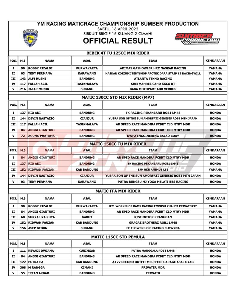 OtomotifZone.com – Bandung. Usai sudah gelarana YM Racing Matic Race yang berlangsung (16/4/22) di Sirkuit Brigif Kujang II Cimahi Bandung, Jawa Barat. Tidak sedikit juga pebalap papan atas dan tim dari luar Jawa Barat yang ikut serta dalam gelaran ini. Pebalap terbaik keluar sebagai juara. Berikut daftar juaranya: