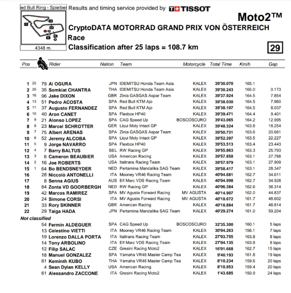 OtomotifZone.com-Austria. Laga Moto2 sirkuit Spielberg, Austria 21 Agustus 2022 sukses di kuasi duet Idemitsu Honda Team Asia. Lewat Ai Ogura yang keluar sebagai juara dan Somkiat Chantra sebagai runner-up. Duet ini kembali bersanding di podium bersama.