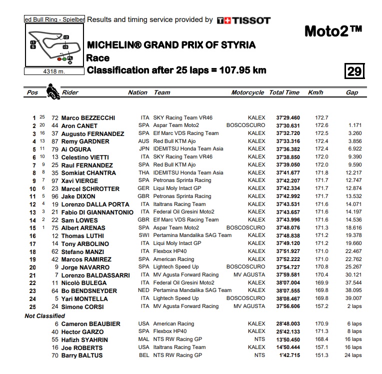 Hari ini di kandang Red Bull juga KTM, akhirnya Benzzecchi bisa memaksimalkan potensi motor bahkan overtake Remy Gardner sebagai pembalap yang di gadang-gadang bakal menang di kandang. Berikut hasil racenya.