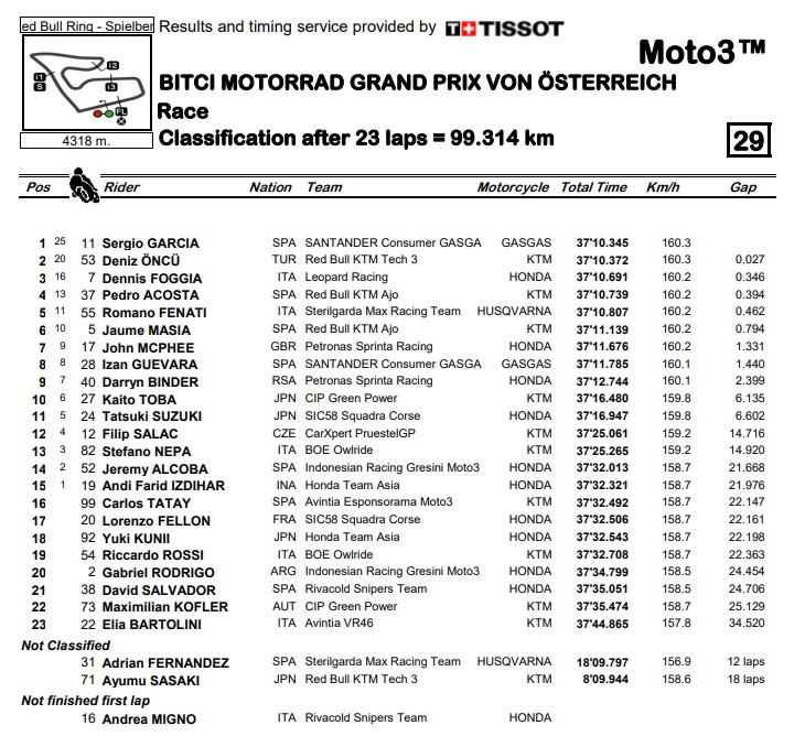 OtomotifZone.com-Austria. Kelas Moto3 di Sirkuit Austria sukses di menangkan Sergio Garcia setelah overtake Deniz Oncu di dua tikungan sebelum finish. Seri 11 gelaran MotoGP tahun ini yang kembali digelar di Sirkuit yang sama Minggu kemarin ternyata sanggup mengubah isi podium.