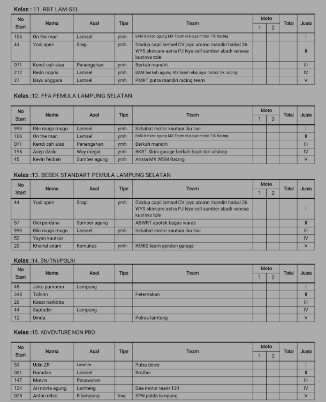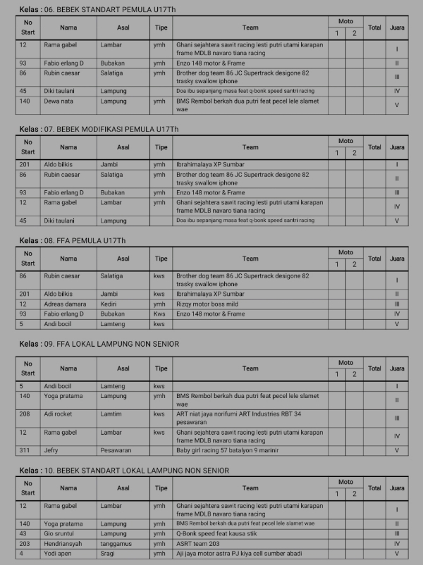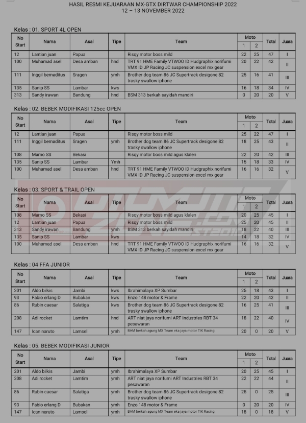Racing Roda 2GrasstrackRace Results Hasil Motocross Grasstrack Dirt War Lampung 2022 Penulis Hafid Hapid - 14 November 2022 0 208 FacebookXPinterestWhatsApp OtomotifZone.com-Kalianda. Berikut hasil dari Motocross Grasstrack Dirt War di sirkuit Way Ragom, Kalianda, Lampung Selatan 12-12-13 November 2022. Penulis : Hafid | Foto : Istimewa