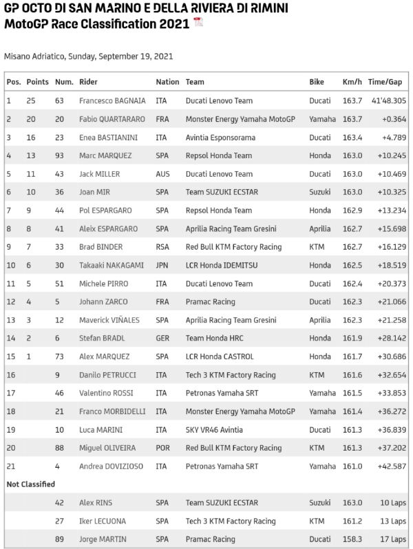 Tak ada kesalahan apapun selepas start dari grid pertama hasil kualifikasi hari sabtu. Pecco 100% memimpin balap full lap. Masalah datang saat menit-menit akhir mungkin faktor grip ban motor Ducati Desmosedicinya mulai habis. Terlihat gap dengan Fabio Quartararo lap per lap mendekat dengan cepat. Beruntung pengerahan kekuatan menjelang lap terakhir bisa di atasi. Pecco juara di kandang dan berhasil mencatat sejarah buat dirinya sendiri juga Ducati.