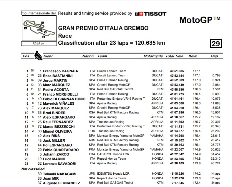 Sementara itu, rekan setimnya, Enea Bastianini, juga memberikan penampilan yang tak kalah impresif. Bastianini mampu menjaga ritme balapnya dan melakukan beberapa manuver kunci untuk mengamankan posisi kedua. Posisinya sebelumnya malah seperti tidak akan ada di podium. Tapi rasa ingin bersama di podium membuat Bestia harus ngegas. Akhirnya posisi kedua pun berhasil ia tempati.