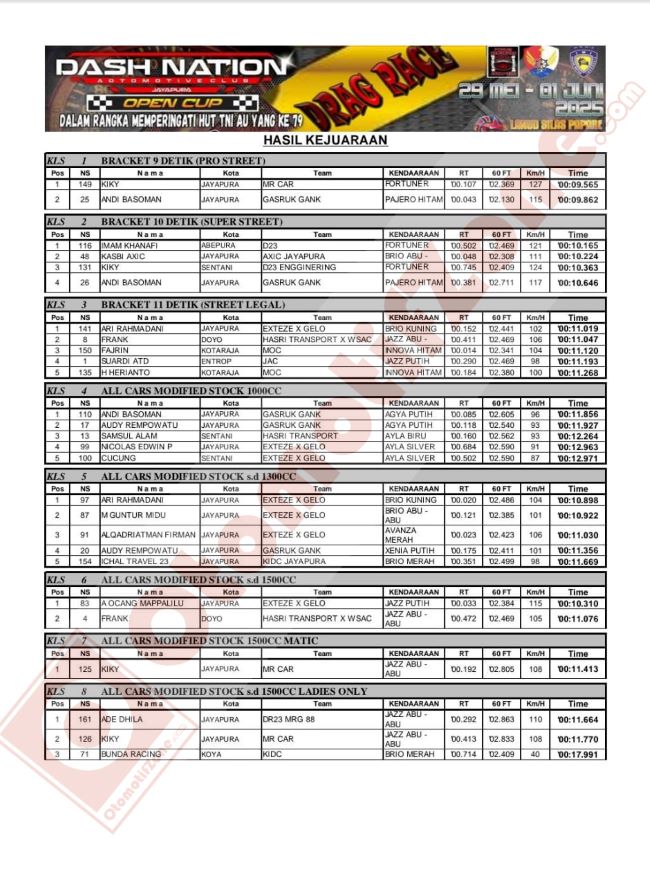 Sukses terlaksana dan berjalan lancar pada akhir pekan ini, di Sirkuit Non Permanen (NP) Lanud Silas Papare, Sentani, Kabupaten Jayapura yang berlangsung Minggu (1/6/2025). Berikut Hasil Pemenangnya: