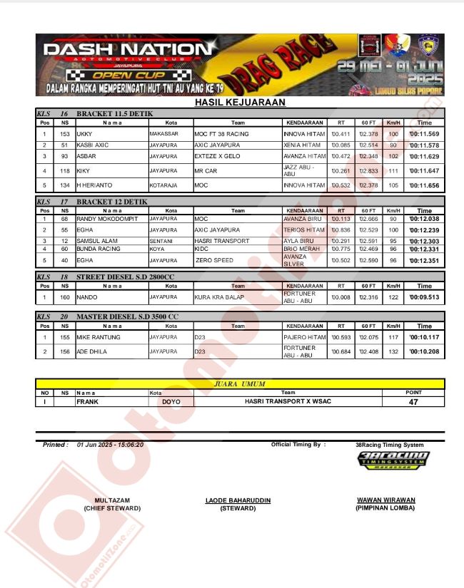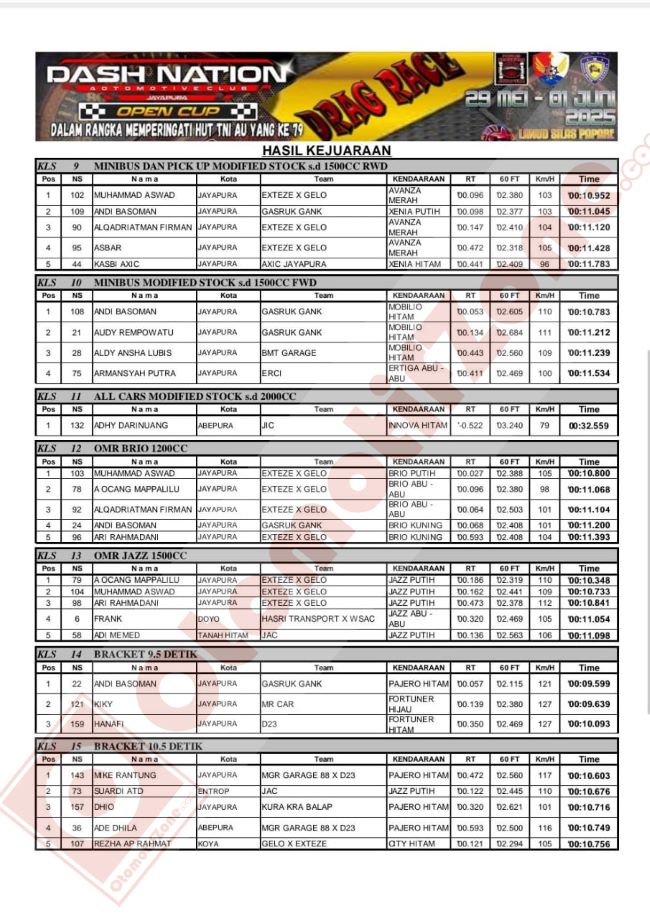 Otomotifzone.com – Jayapura. Usai sudah Kejuaraan Dash Nation Open Cup Drag Race & Drag Bike memperingati HUT TNI-AU Ke 79 tahun yang telah tergelar oleh komunitas roda empat Dash Nation Chapter Jayapura.