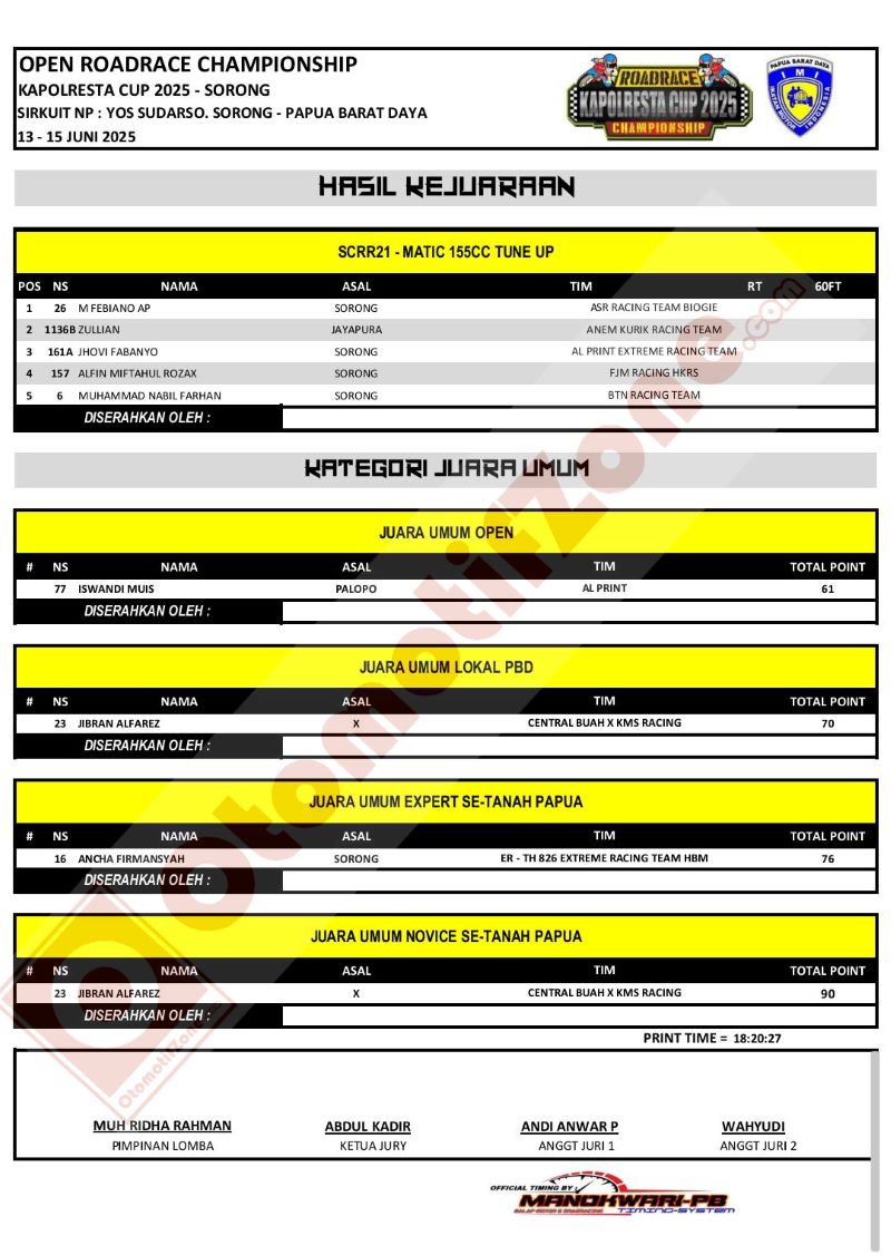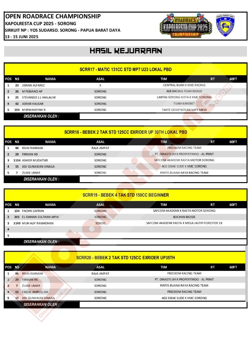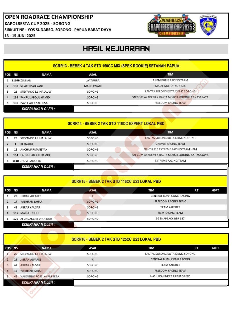 Berikut hasil pemenang Kapolresta Cup 2025 Road Race Championship Sorong :