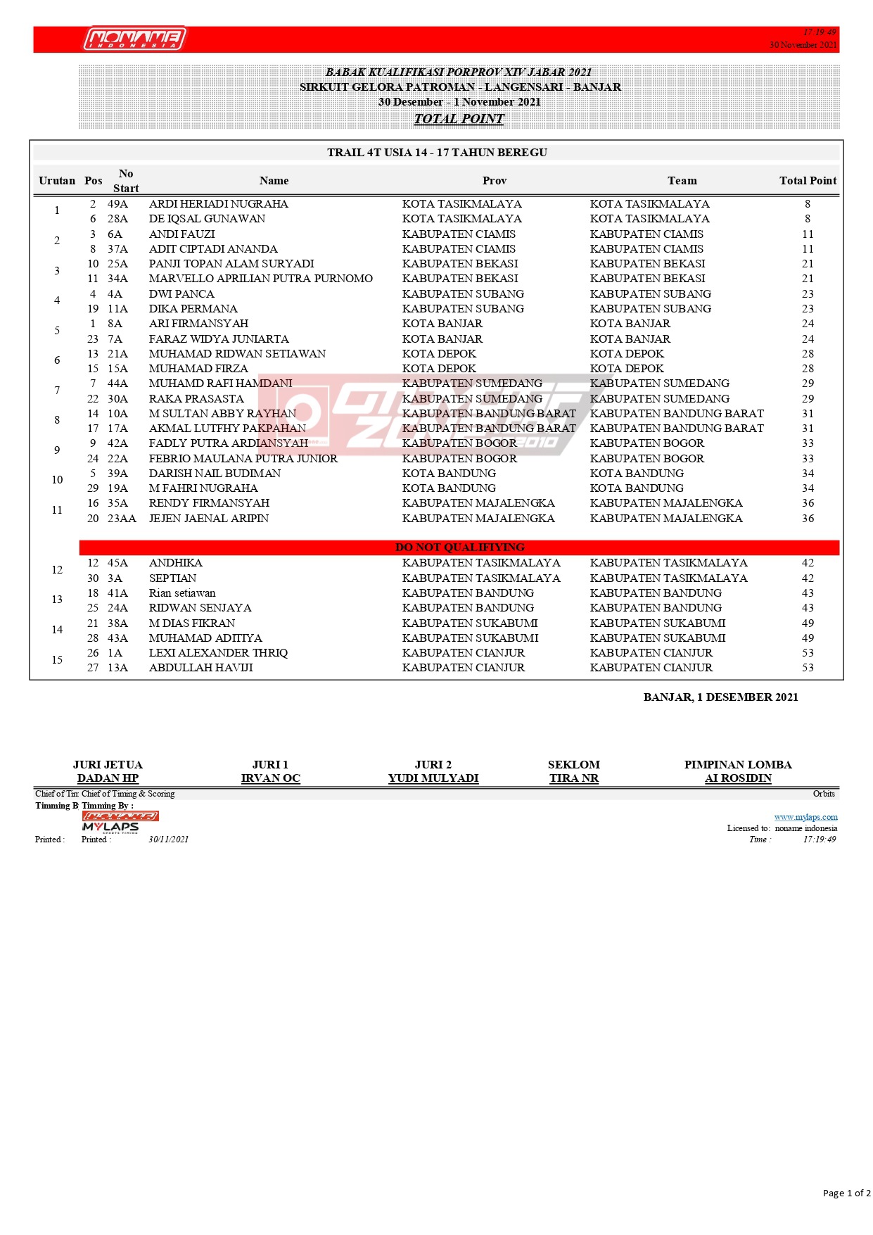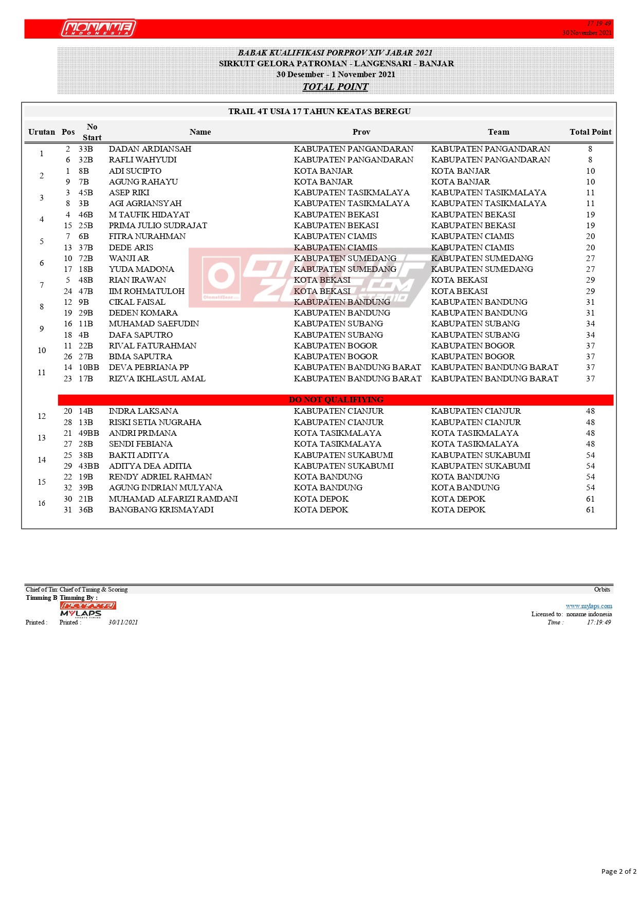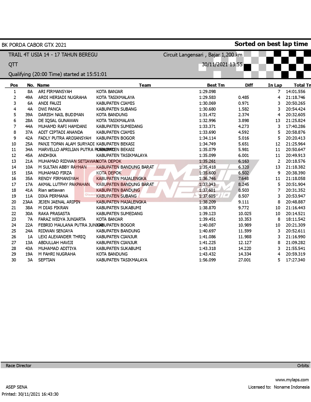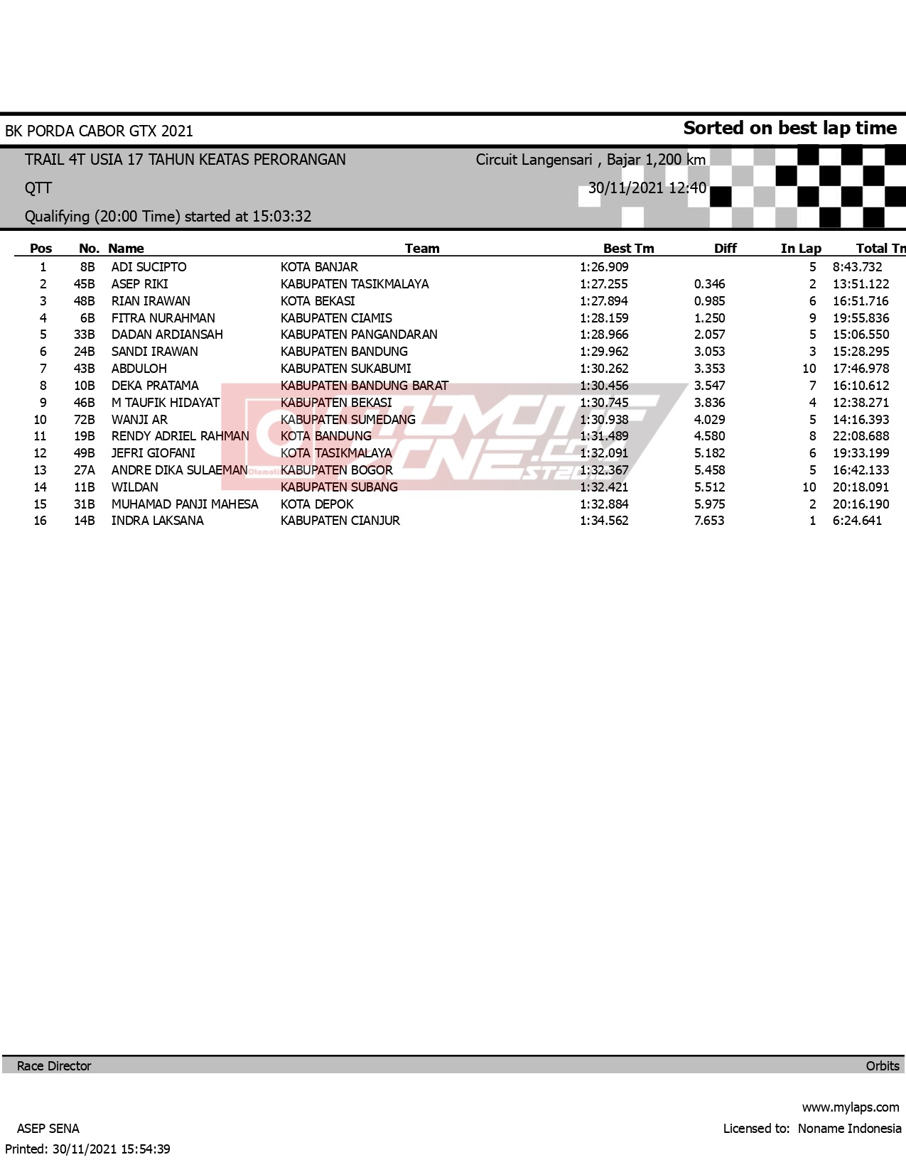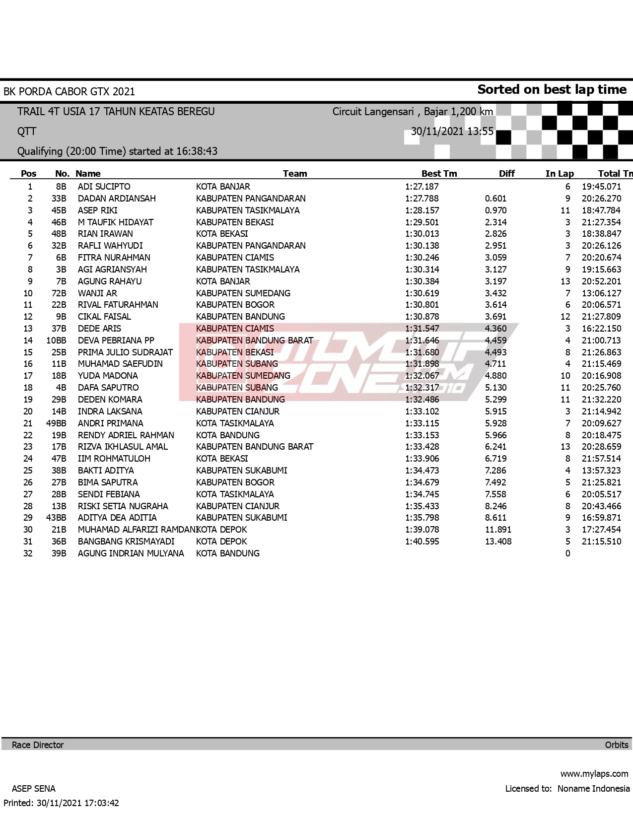OtomotifZone.com – Banjar. Hasil QTT (Qualifying Time Trial) Babak Kualifikasi Porprov XIV 2021 Jawa Barat yang berlangsung di sirkuit Gelora Patroman, Kota Banjar, Jabar, Selasa (30/11), berjalan lancar.