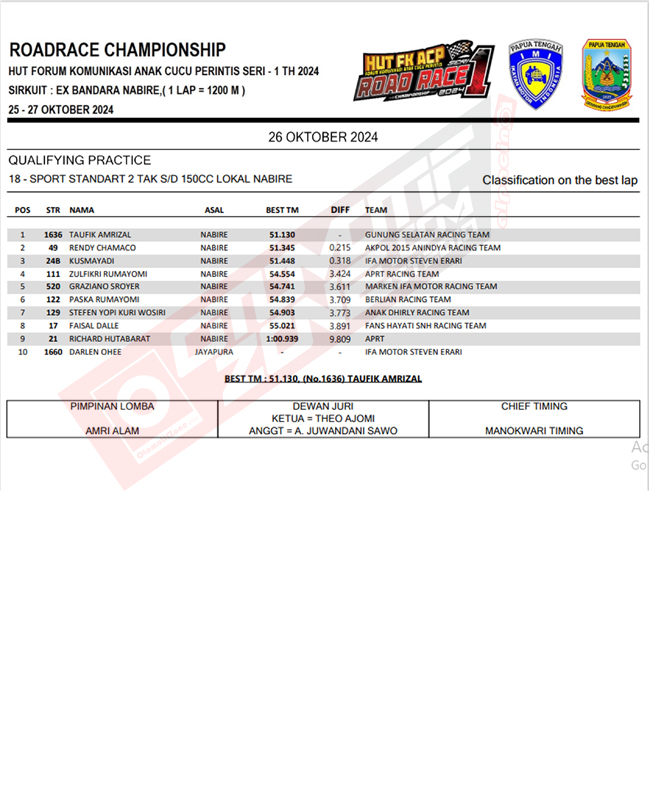 Berikut hasil qualifying HUT FKACP Road Race Nabire Seri I :