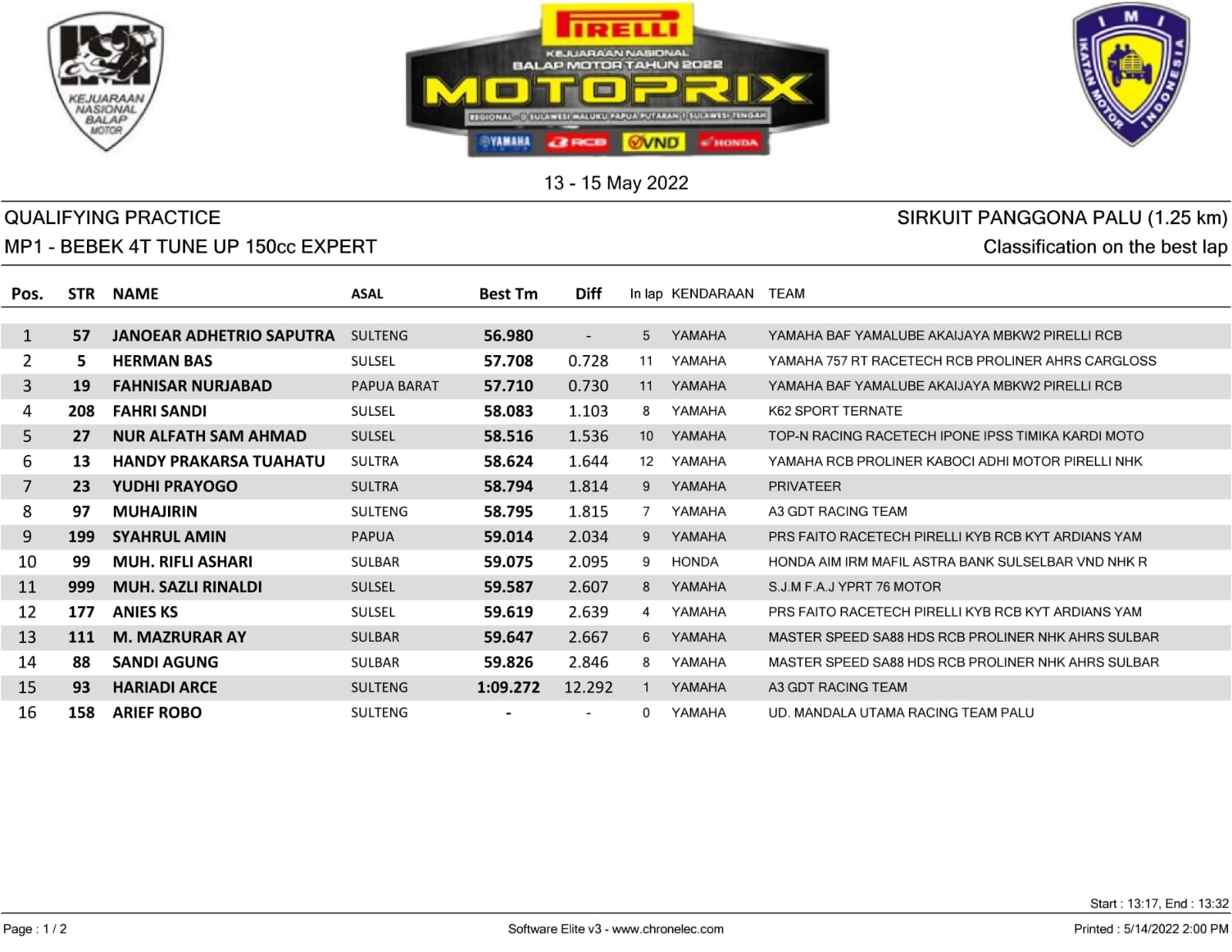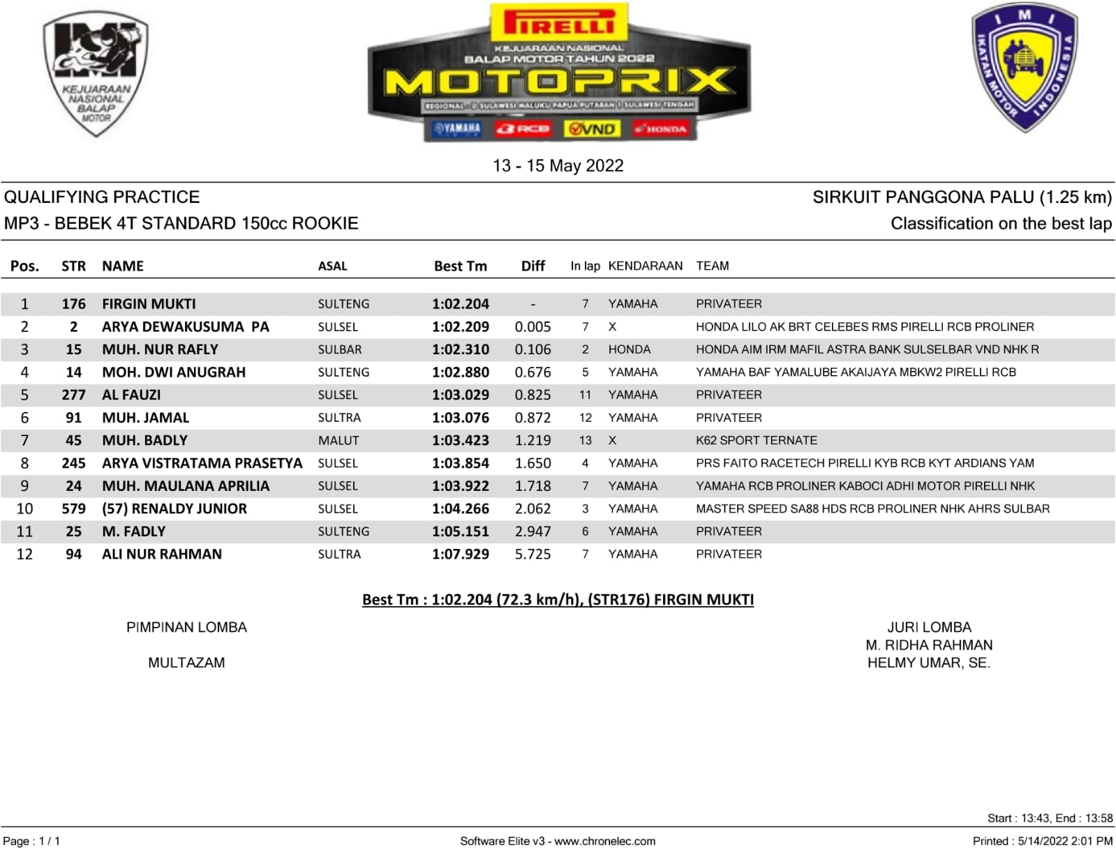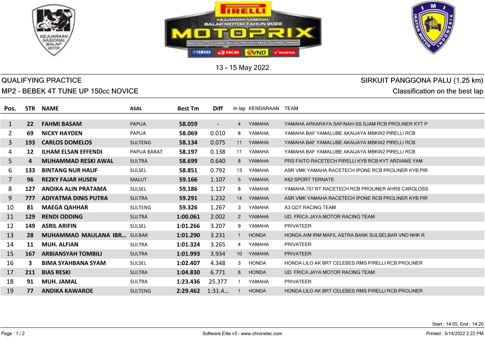 Gelaran yang menjalankan penentuannya pada esok hari (15/5/2022), hasil Qualifying Practice menjadi modal penting, agar menjalani Final Race Day nantinya. Sekaligus menjadi semangat menjalani balapan. Berikut hasil yang berhasil Penulis rangkum.