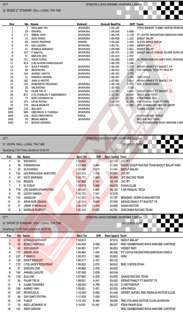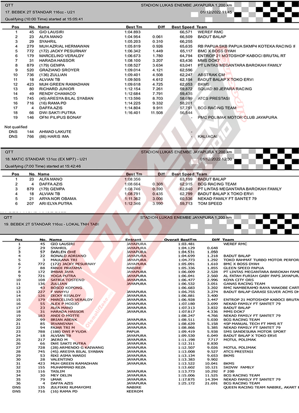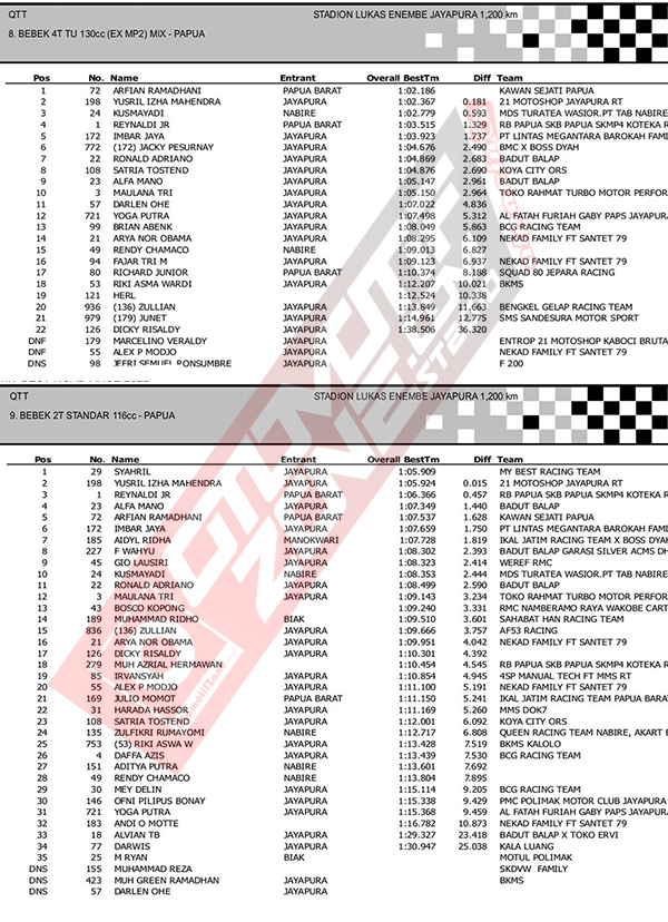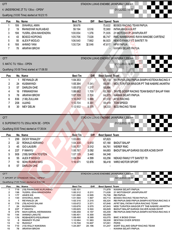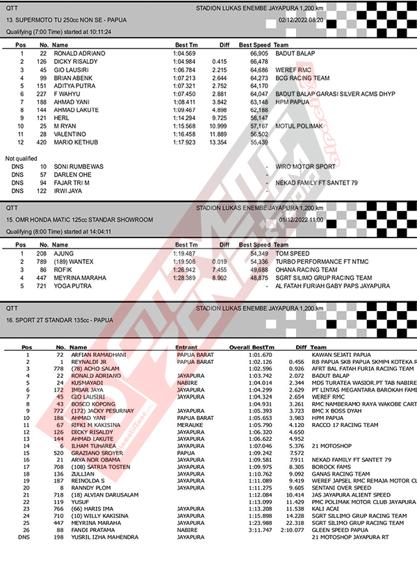 OtomotifZone.Com – Jayapura. Penampilan para pembalap pada sesi QTT di gelaran Mybest Road Race Series Championship 2022 Jayapura pada hari pertama dan kedua (1,2/11) dilintasan 1,200 meter cukup menantang dimana masing-masing pembalap begitu tampil prima untuk berikan catatan waktu tercepatnya. Tentunya mereka konsentrasi penuh untuk menuntaskan babak tersebut guna mendapatkan posisi grid start terdepan nantinya dan melanjutkan pertarungan pada race penentu di hari penutup gelaran tersebut pada sirkuit NP Stadion Lukas Enembe, Kabupaten Jayapura.