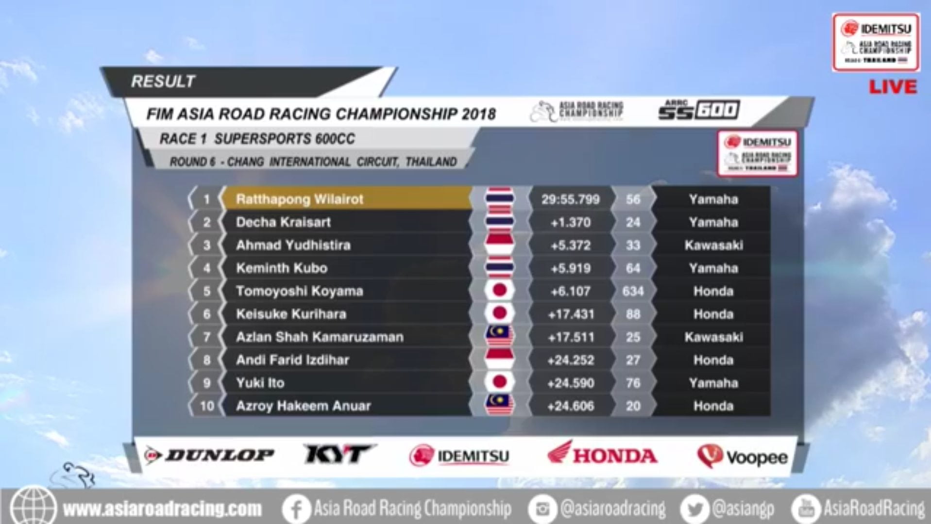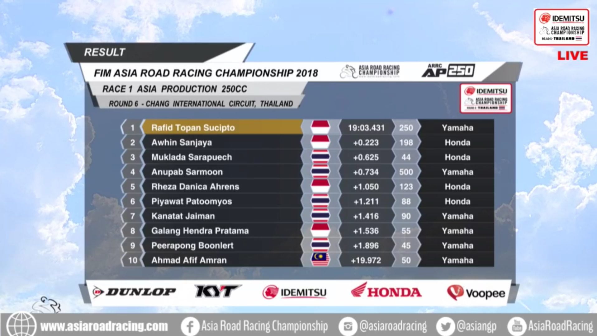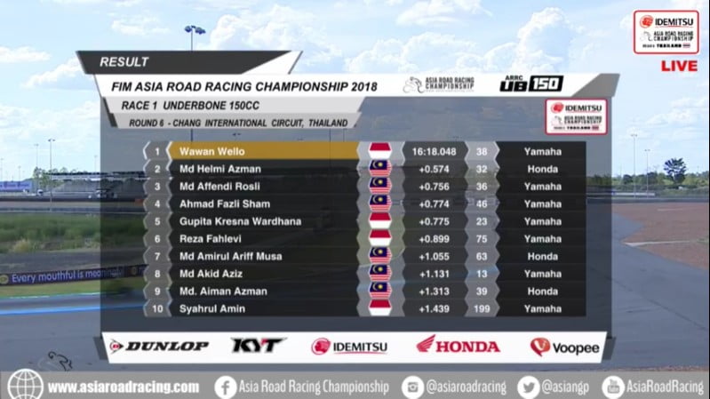Race ResultsRacing Roda 2Road Race Hasil Race 1 Final ARRC 2018 Thailand Penulis OtomotifZone.com - 1 Desember 2018 0 3335 FacebookXPinterestWhatsApp OtomotifZone.com – Thailand. Berikut ini adalah hasil Race 1 putaran final gelaran Asian Road Racing Championship 2018 yang berlangsung di Chang Internasional Sirkuit, Buriram, Thailand, Sabtu (1/12). Penulis : Nana Triana