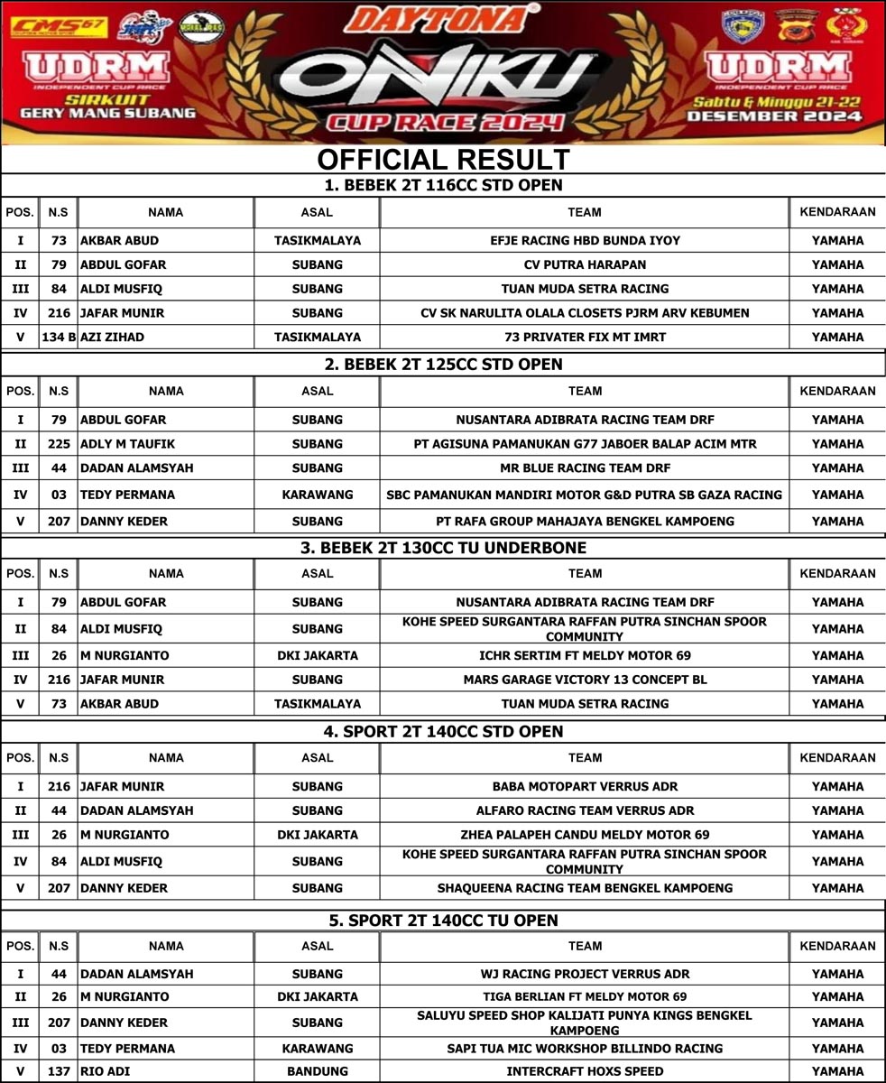 Berikut hasil race event Daytona Oniku Cup Race 2024 yang digelar Sabtu-Minggu, 21-22 Desember 2024.