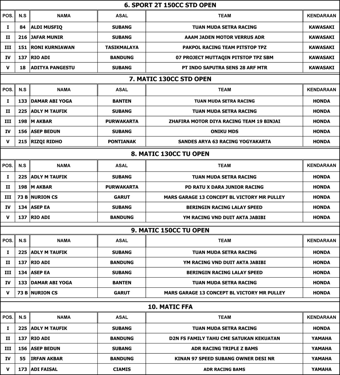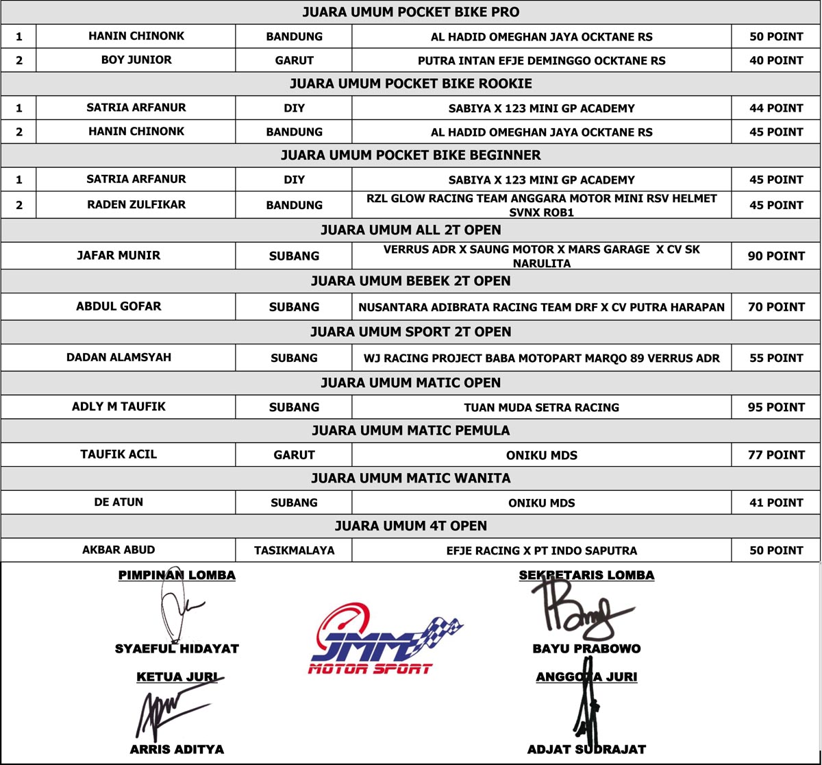 OtomotifZone.com-Subang. Gelaran road race dipenghujung bulan Desember tahun 2024 sukses digelar di Sirkuit Gery Mang Subang, Dikuti 450 starter dari total 29 kelas ini melahirkan beberapa kampuin dikelas yang digelar dan beberapa pembalap menjadi juara umum.