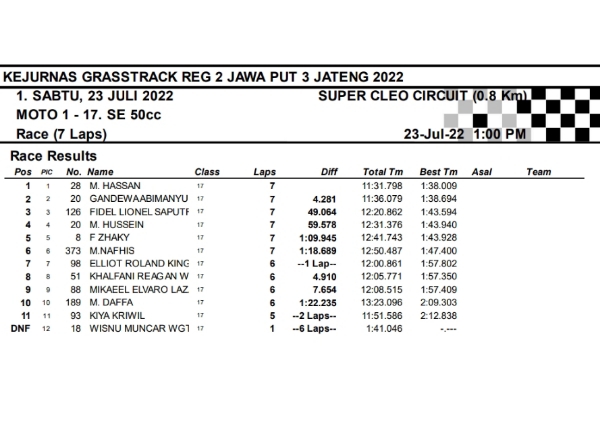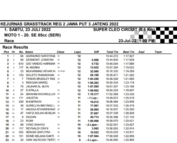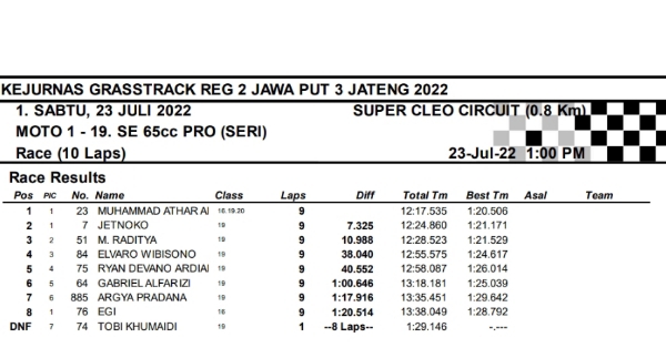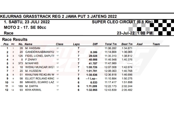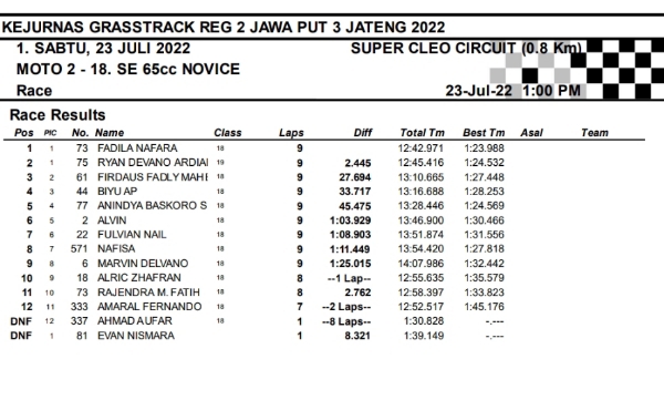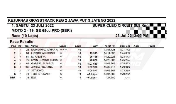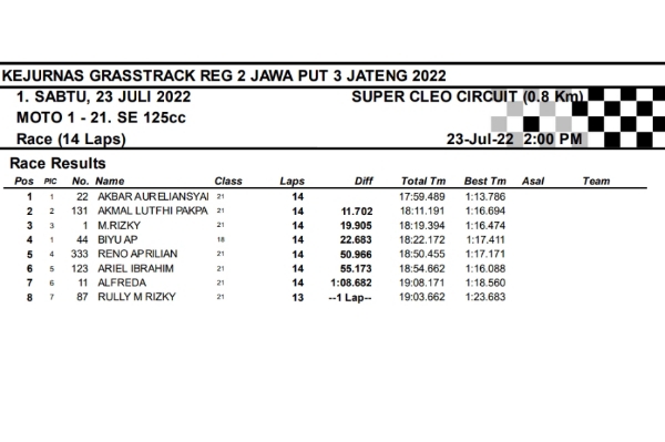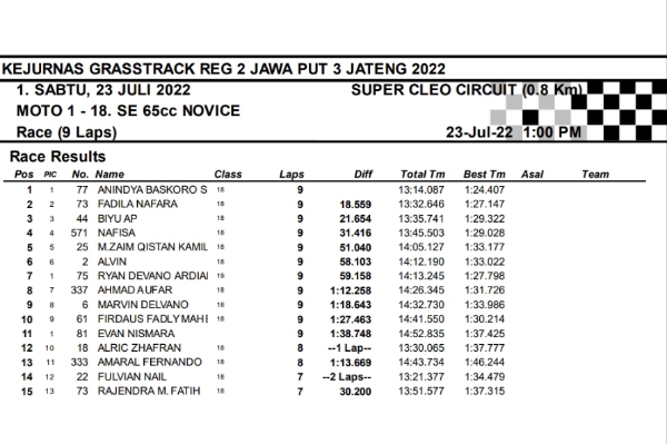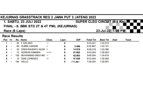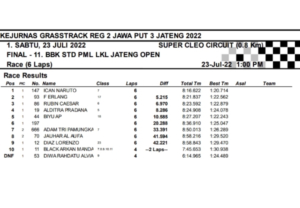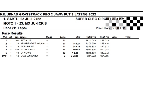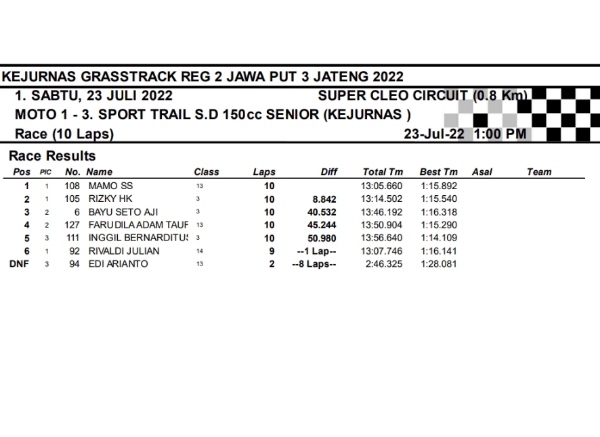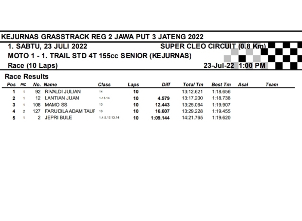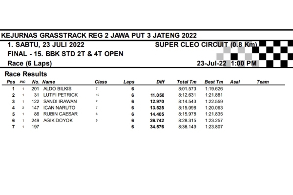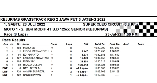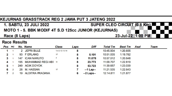 Racing Roda 2GrasstrackMotocrossRace Results Hasil Race Hari Pertama Seri 3 Kejurnas Grasstrack Region B & Seri 3 Indiel Super Cleo Kendal Penulis Hafid Hapid - 23 Juli 2022 0 230 FacebookXPinterestWhatsApp OtomotifZone.com-Kendal. Berikut enam belas kelas yang sudah terselesaikan pada seri 3 Kejurnas Grasstrack Region B dan Seri 3 Indiel Grasstrack Motocross sirkuit Super Cleo, Puguh, Kecamatan Boja, Kendal, Jawa Tengah 23 Juli 2022.