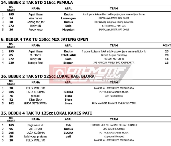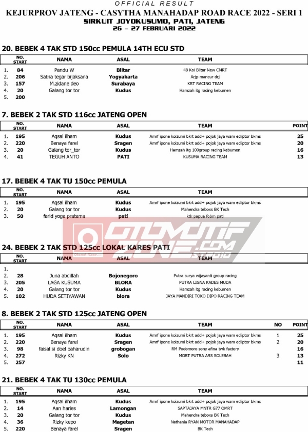 OtomotifZone.com-Pati. Hasil race hari sabtu yang sudah terlaksana pada event kejurprov Jateng – Casytha Manahadap Road Race sirkuit Joyo Kusumo, Pati, Jawa Tengah 26 Februari 2022 ternyata cukup banyak. Ada sepuluh kelas yang sudah selesai di laksanakan pada hari Sabtu ini pada gelaran perdana event dengan materi lebih mantab dari event tahun sebelumnya yang sempat tertunda. Berikut kita lihat hasil race selesai sore tadi.