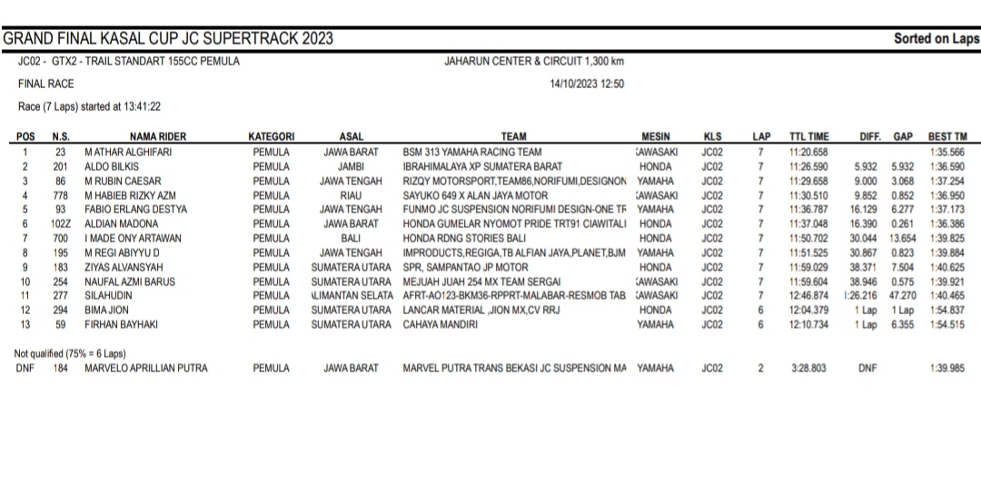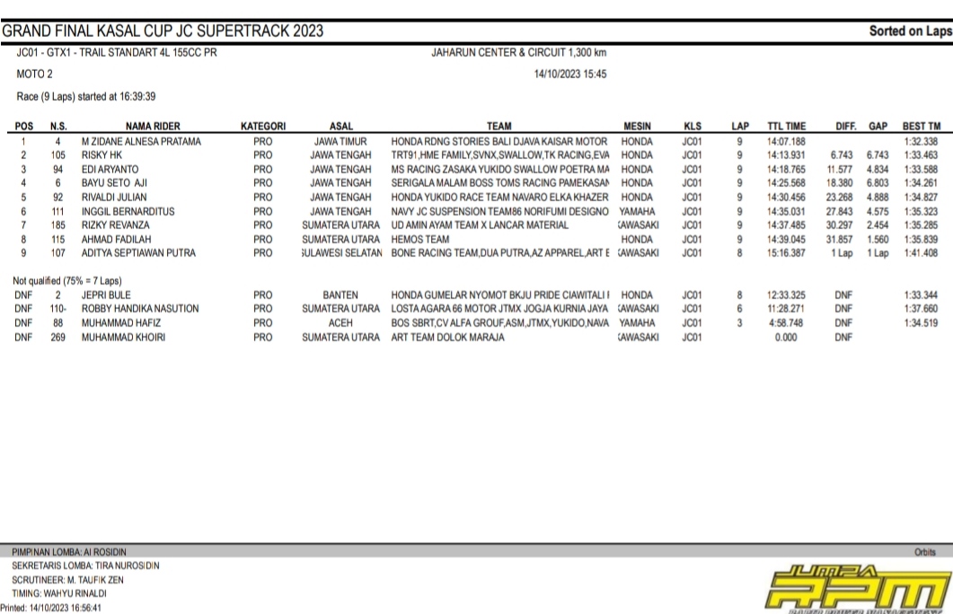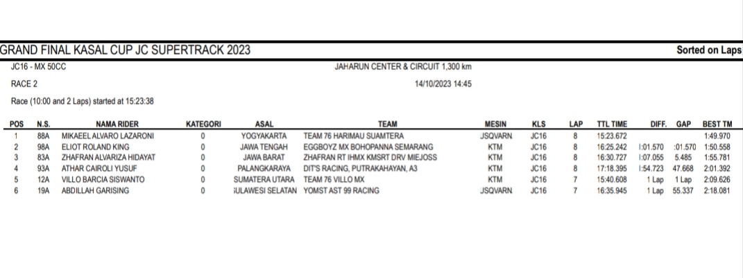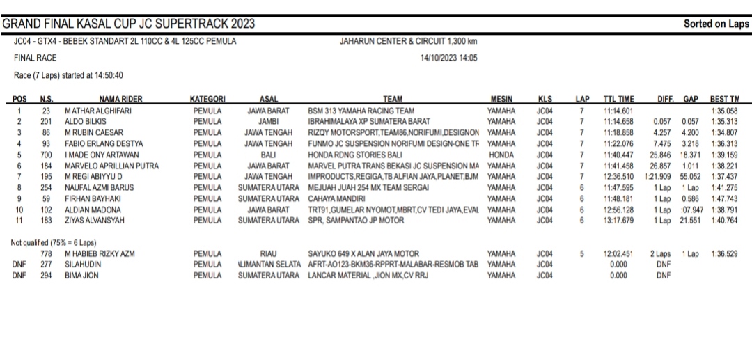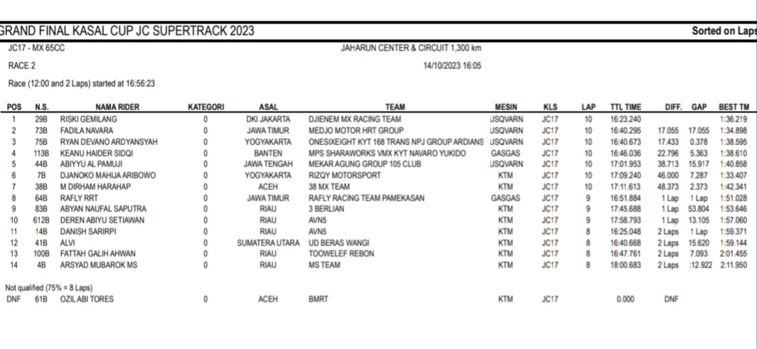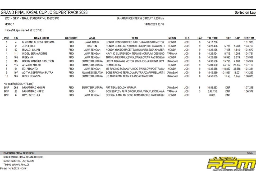 Racing Roda 2GrasstrackMotocross Hasil Race Sabtu Final Kasal Cup JC Supertrack Jaharun Penulis Hafid Hapid - 14 Oktober 2023 0 491 FacebookXPinterestWhatsApp OtomotifZone.com-Deli Serdang. Berikut hasil race hari pertama diGrand Final Kasal Cup JC Supertrack sirkuit Jaharun Center, Deli Serdang, Sumatera Utara 14 Oktober 2023.