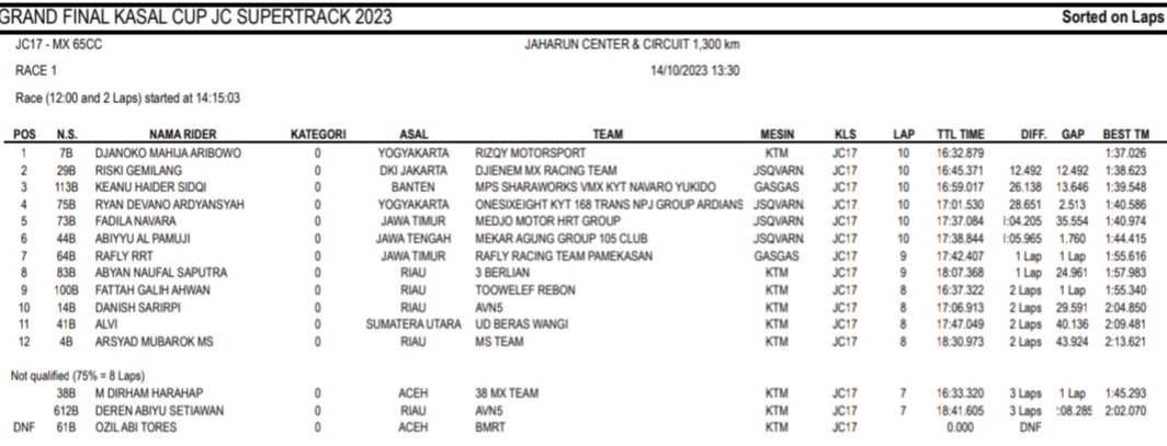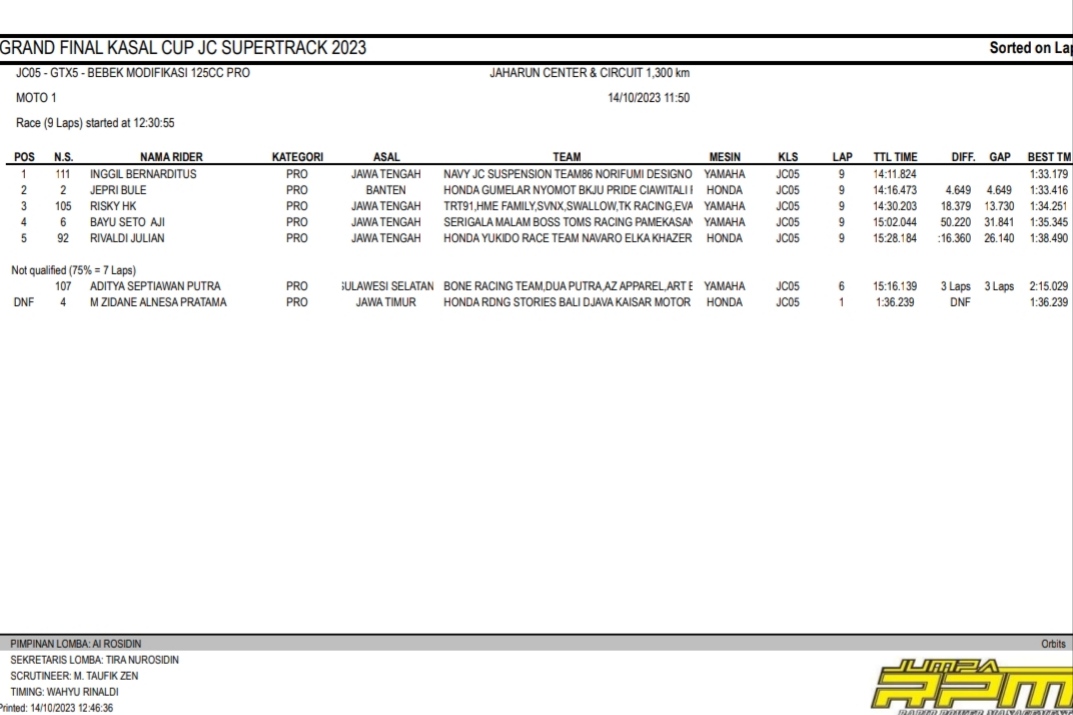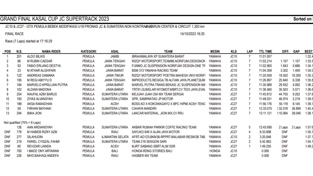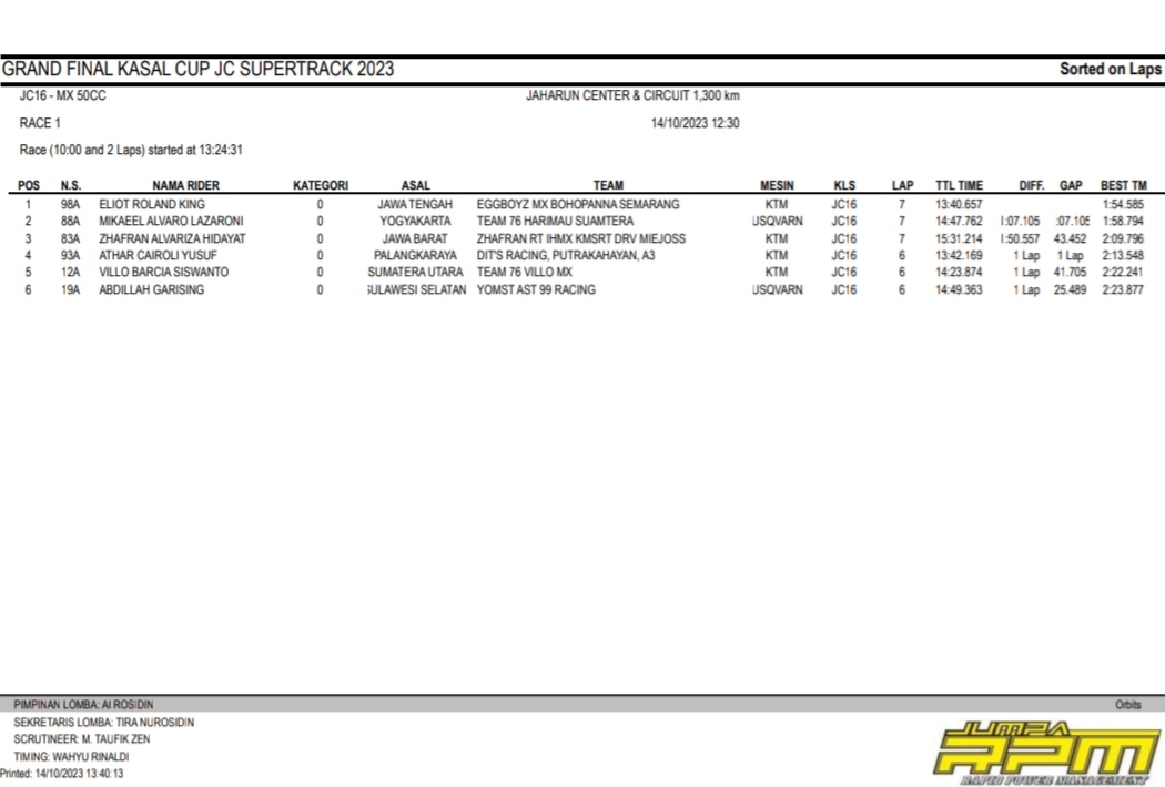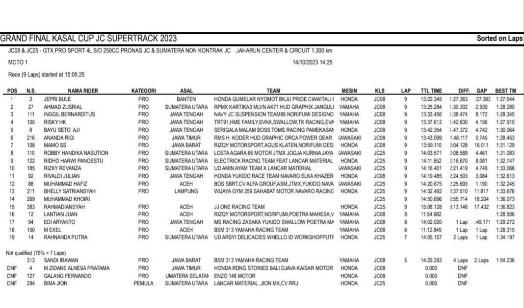 Racing Roda 2GrasstrackMotocross Hasil Race Sabtu Final Kasal Cup JC Supertrack Jaharun Penulis Hafid Hapid - 14 Oktober 2023 0 491 FacebookXPinterestWhatsApp OtomotifZone.com-Deli Serdang. Berikut hasil race hari pertama diGrand Final Kasal Cup JC Supertrack sirkuit Jaharun Center, Deli Serdang, Sumatera Utara 14 Oktober 2023.