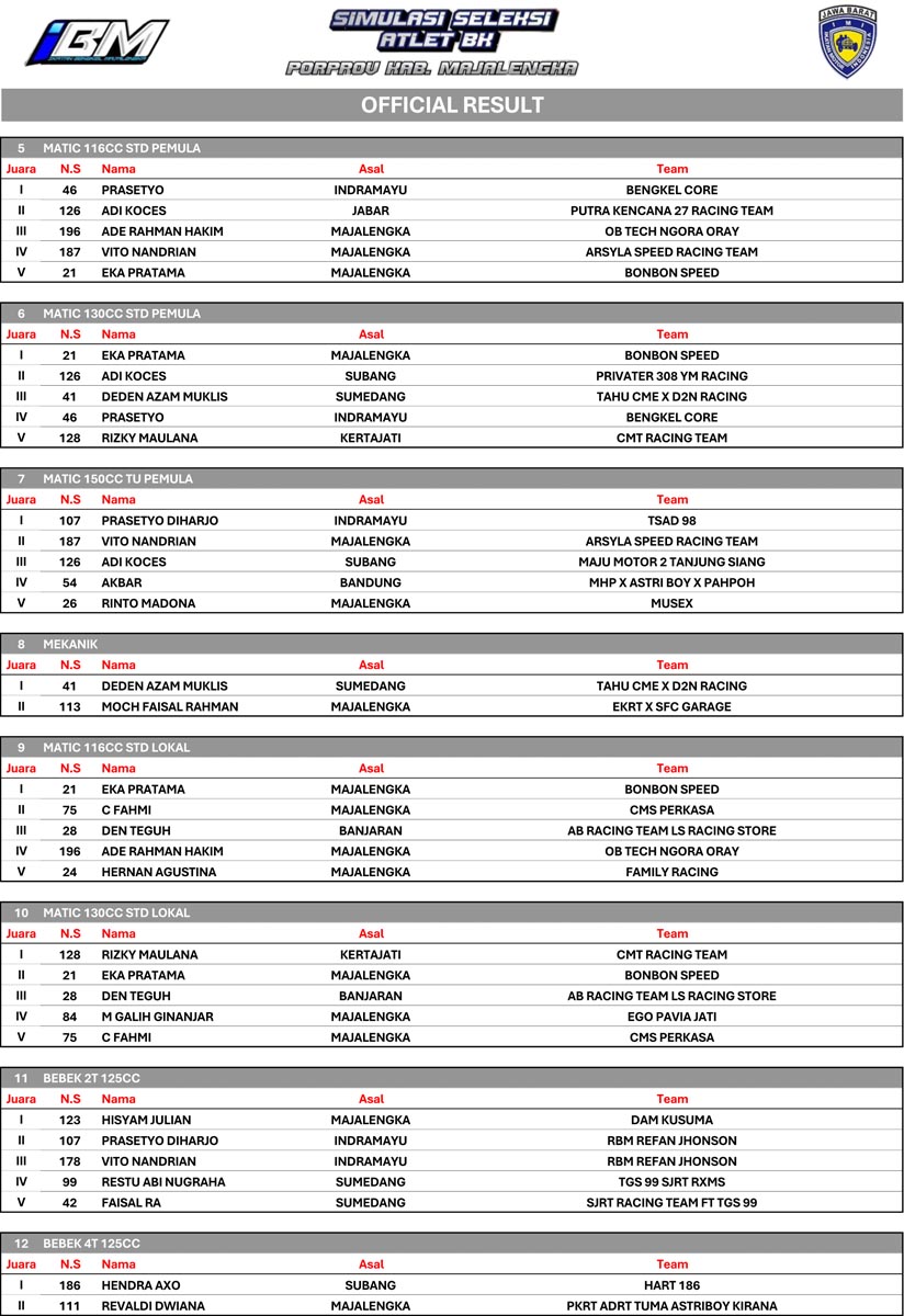 Hasil race Simulasi Seleksi atlet Porprov Kabupaten Majalengka.