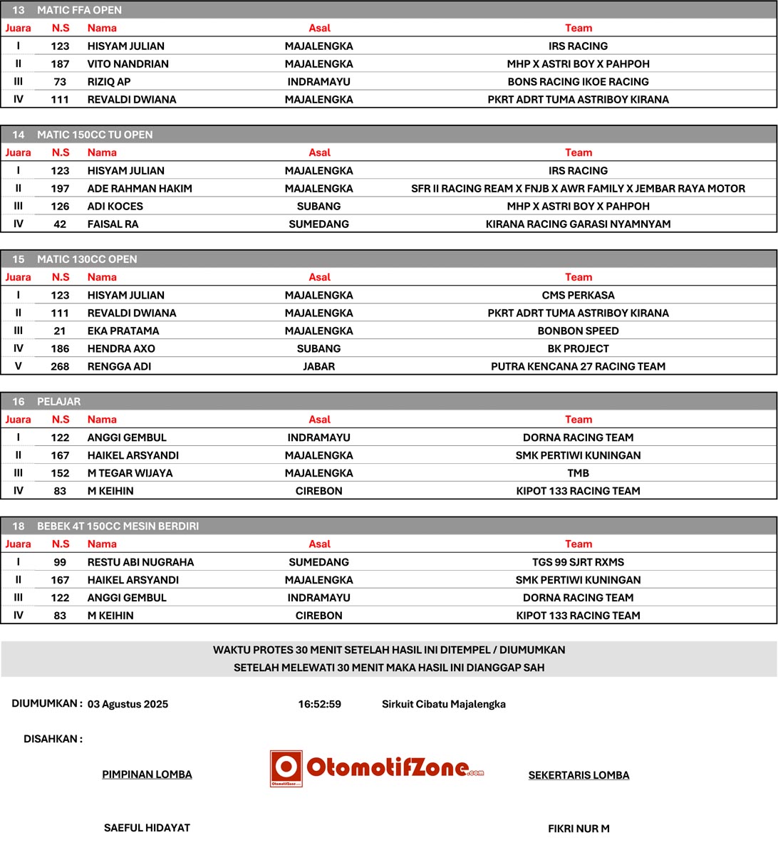 Event yang dibuka secara langsung oleh Bakti Anugrah selaku ketua KONI didampingi ketua bidang 2 pembinaan dan prestasi dan Ahong dari IBM berjalan lancar dan berhasil menseleksi atlit balap motor yang akan digelar di Kota Tasikmalaya medio Oktober tahun ini.