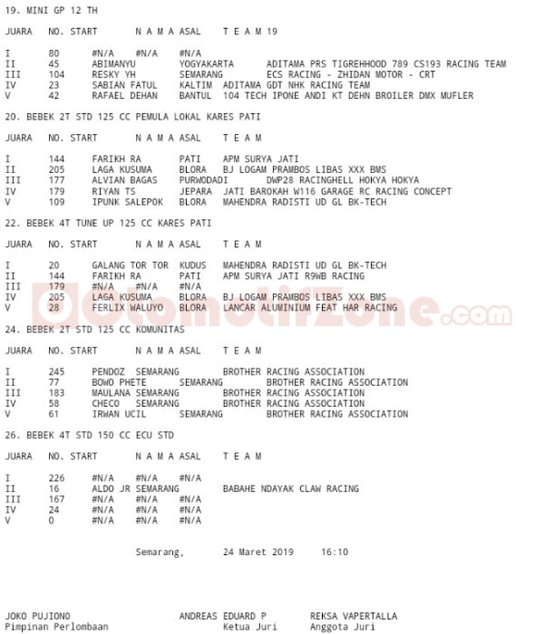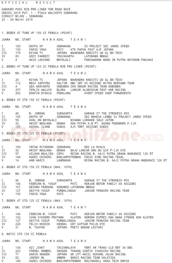 Race ResultsRacing Roda 2Road Race Hasil Seri 1 Gadhuro Road Race – Mijen, Semarang 2019 Penulis Hafid Hapid - 24 Maret 2019 0 3846 FacebookXPinterestWhatsApp OtomotifZone.com-Semarang. Berikut hasil Seri 1 Gadhuro Puas RCB Proliner FDR Road Race sirkuit Mijen, Semarang 23-24 Maret 2019. Penulis : Hafid | Foto : Hafid