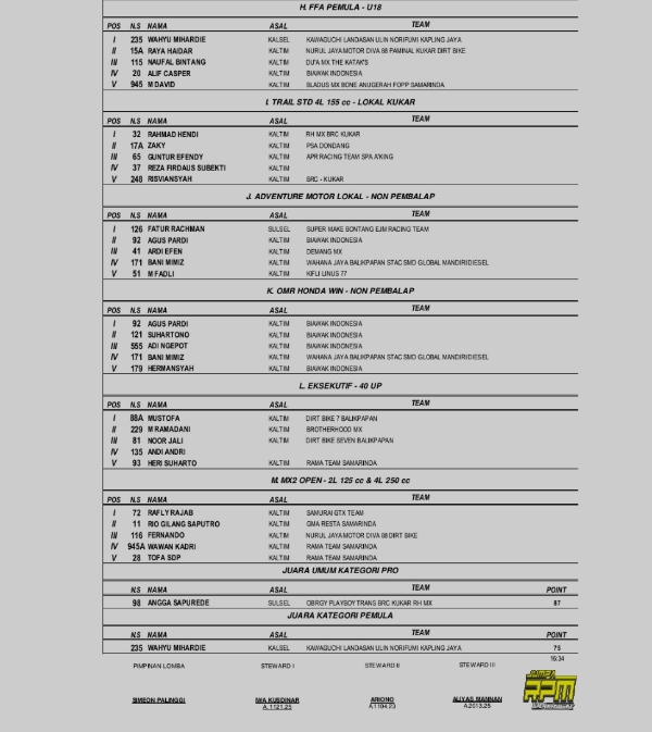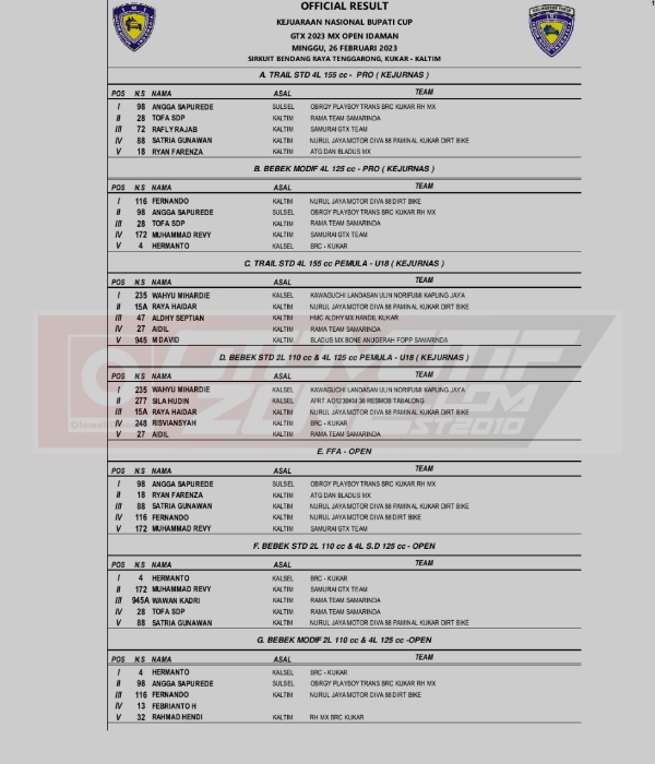 Racing Roda 2MotocrossRace Results Hasil Seri 1 Kejurnas Grasstrack Region 4 Kutai Kartanegara 2023 Penulis Hafid Hapid - 27 Februari 2023 0 345 FacebookXPinterestWhatsApp OtomotifZone.com-Tenggarong. Berikut hasil lomba dari Seri 1 Kejurnas Grasstrack Region 4 sirkuit Bendang Raya Tenggarong, Kutai Kartanegara 25-26 Februari 2023.