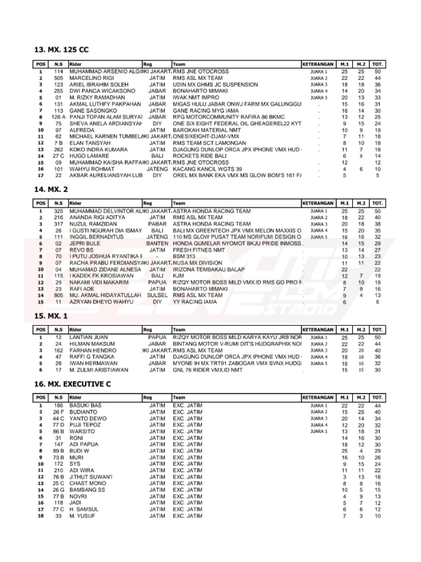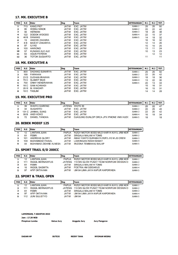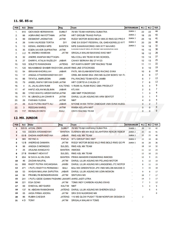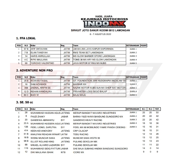 OtomotifZone.com-Lamongan. Berikut hasil dari seri 1 Kejurnas Motocross INDOMX sirkuit Joyo Sanur Kodim 0812 Lamongan, Jawa Timur 6-7 Agustus 2022.