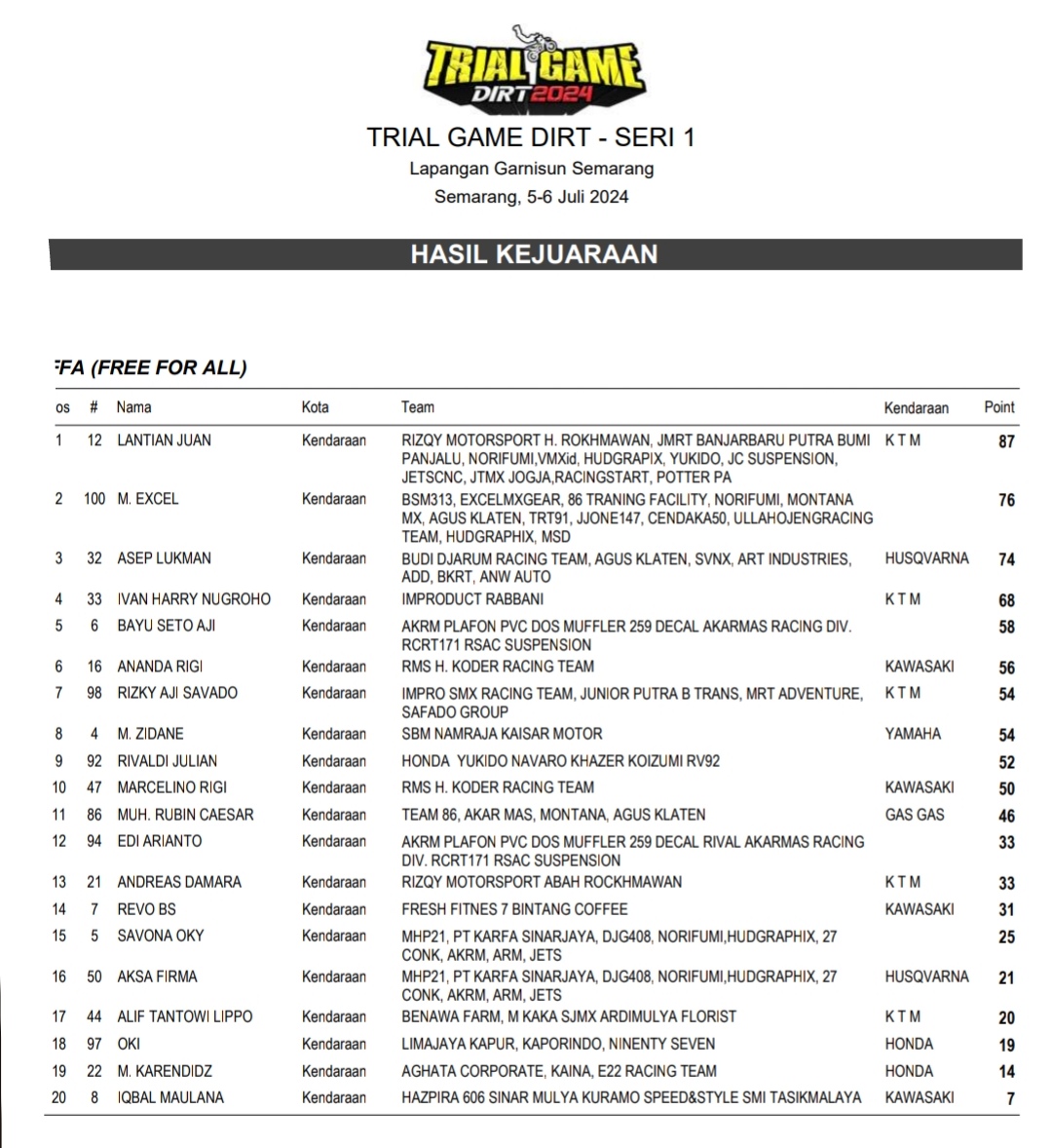 OtomotifZone.com – Semarang. Enam kelas khusus terlaksana dengan baik. Round pertama di kota Atlas ini pun comeback event legendaris setelah absen cukup lama. Berikut hasil Seri 1 Trial Game Dirt di Sirkuit lapangan Garnisun Semarang 5 dan 6 Juli 2024,