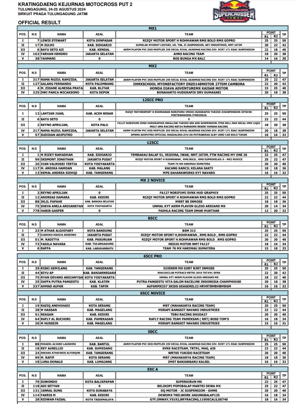 Racing Roda 2GrasstrackMotocrossRace Results Hasil Seri 2 Kratingdaeng Supercroser Kejurnas Motocross Tulungagung Penulis Hafid Hapid - 26 Agustus 2024 0 429 FacebookXPinterestWhatsApp OtomotifZone.com – Tulungagung. Berikut hasil Seri 2 Kratingdaeng Supercroser Kejurnas Motocross 23 – 25 Agustus 2024. Sirkuit Praga Tulungagung – Jawa Timur.