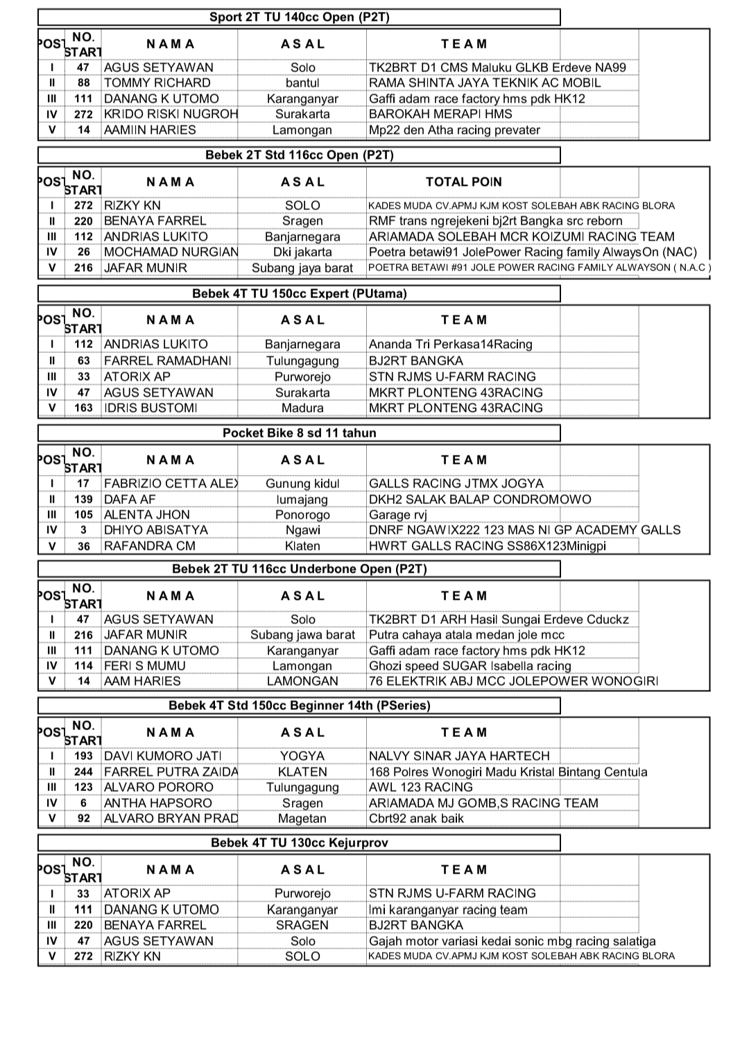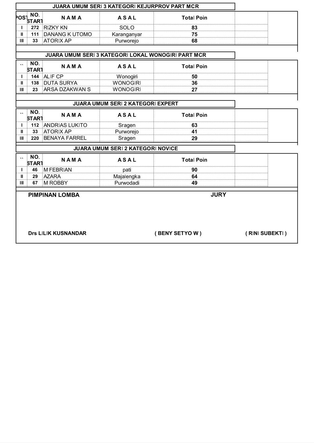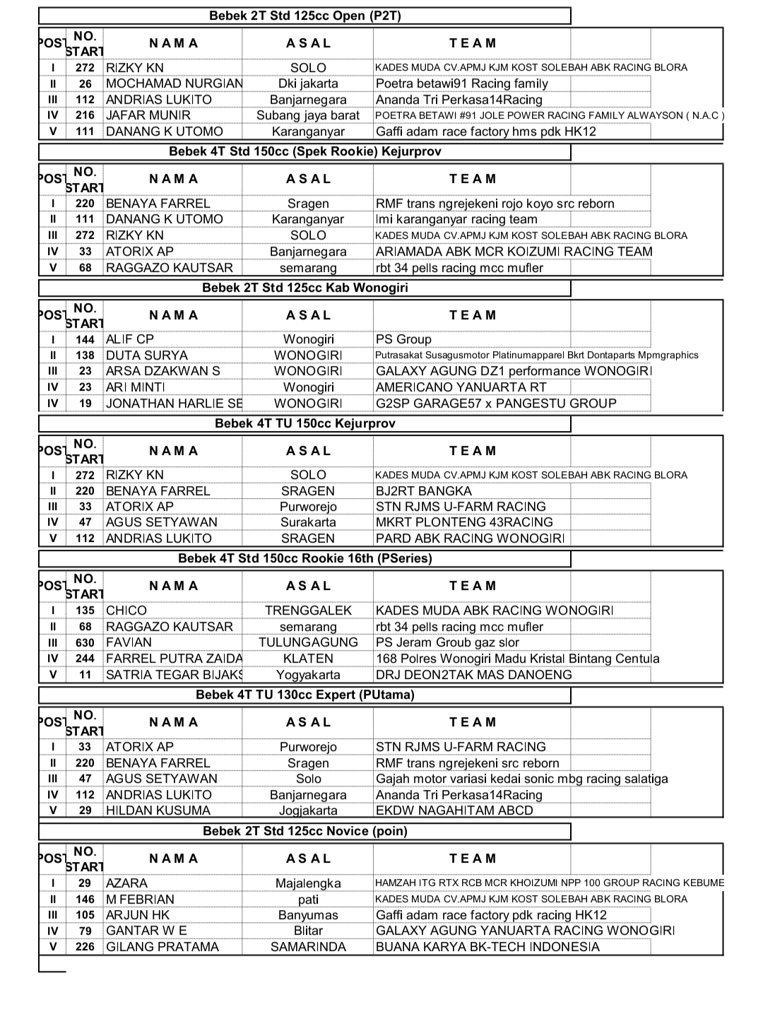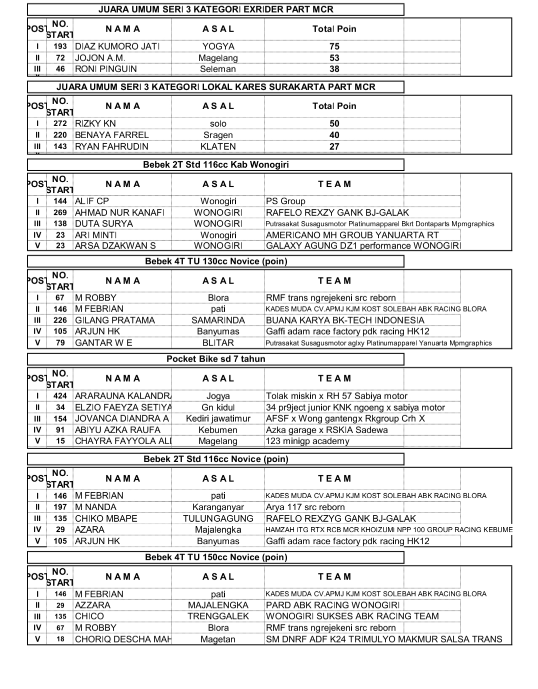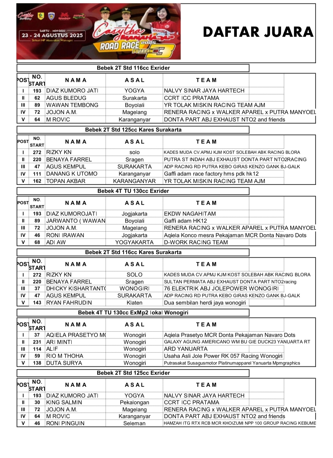 NewsRace ResultsRacing Roda 2Road Race Hasil Seri 3 Casytha Manahadap Wonogiri 2025 Penulis Hafid Hapid - 24 Agustus 2025 0 360 FacebookXPinterestWhatsApp Hasil Seri 3 Casytha Manahadap Wonogiri 2025OtomotifZone.com – Wonogiri. 30 kelas terselesaikan pada Seri 3 Casytha Manahadap Road Race sirkuit Kota Wonogiri 23-24 Agustus 2025. Berikut full hasil balapnya.