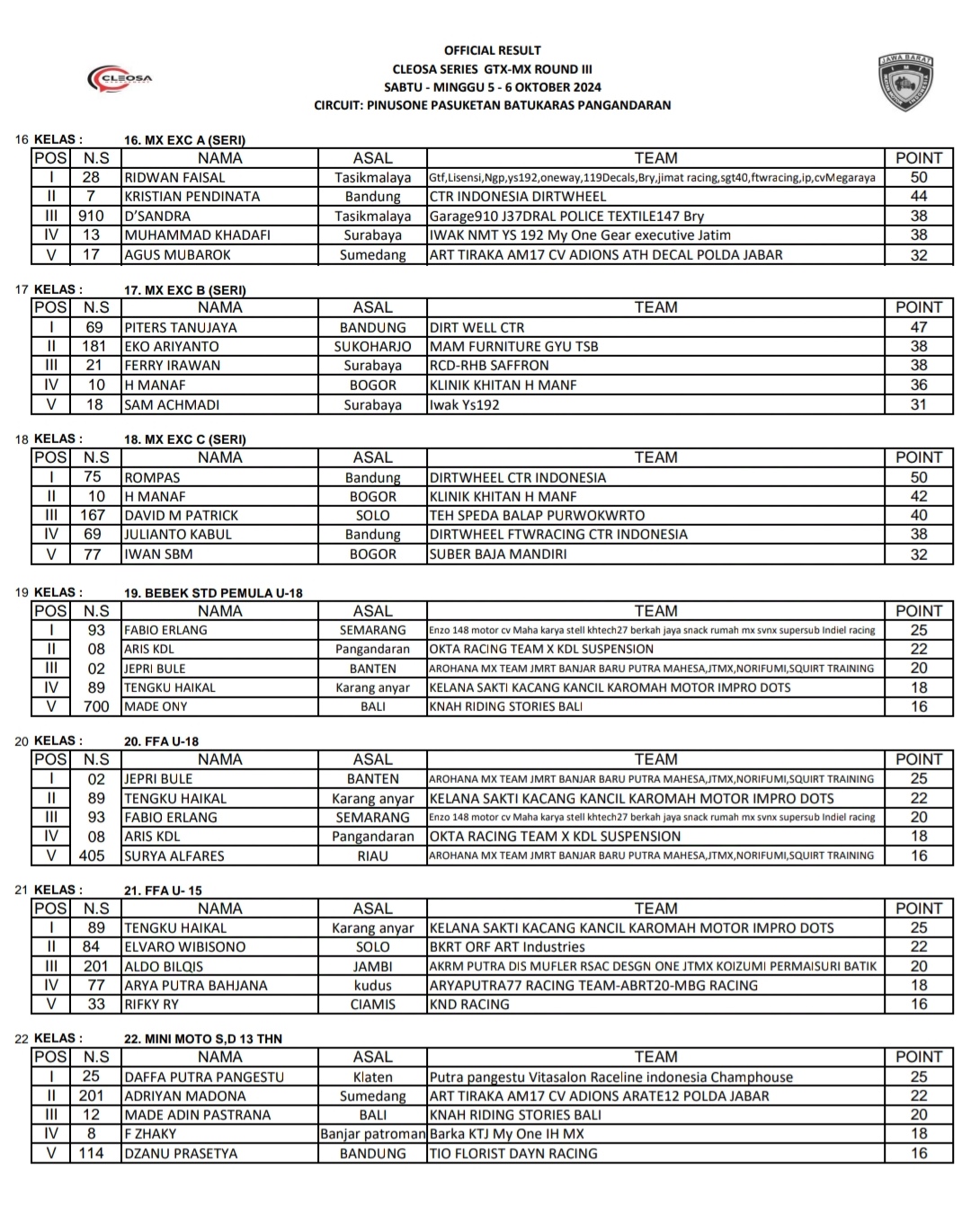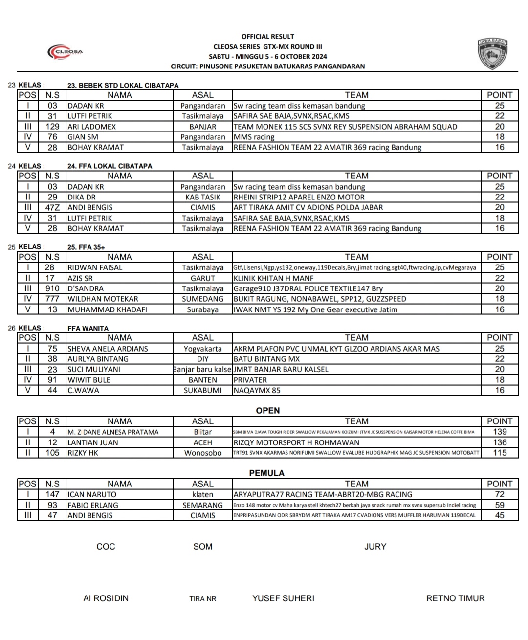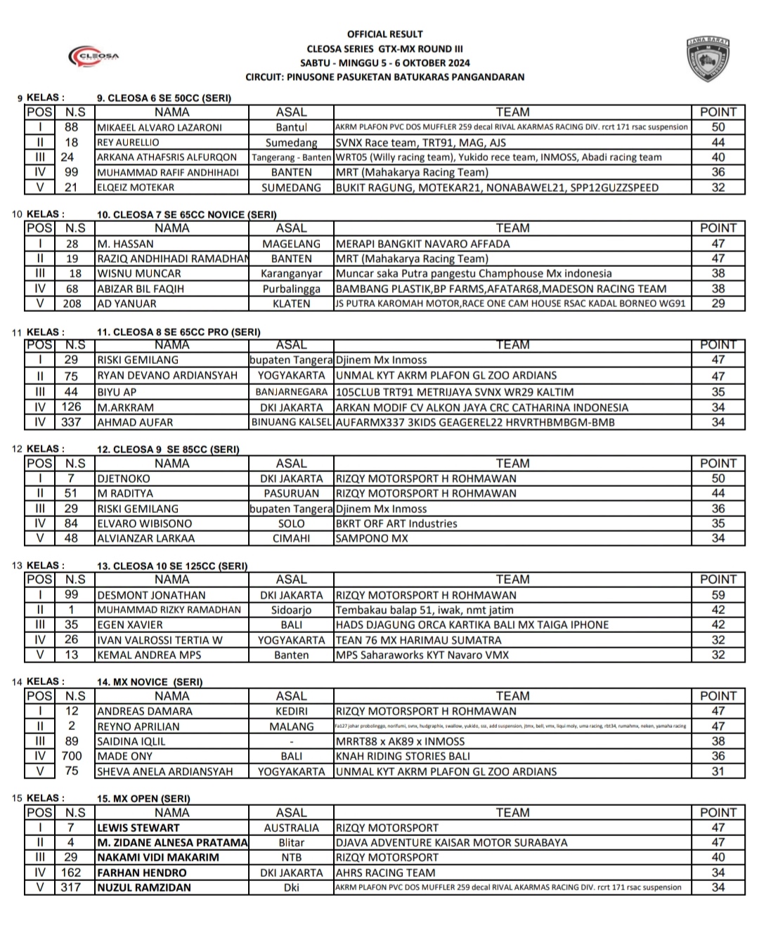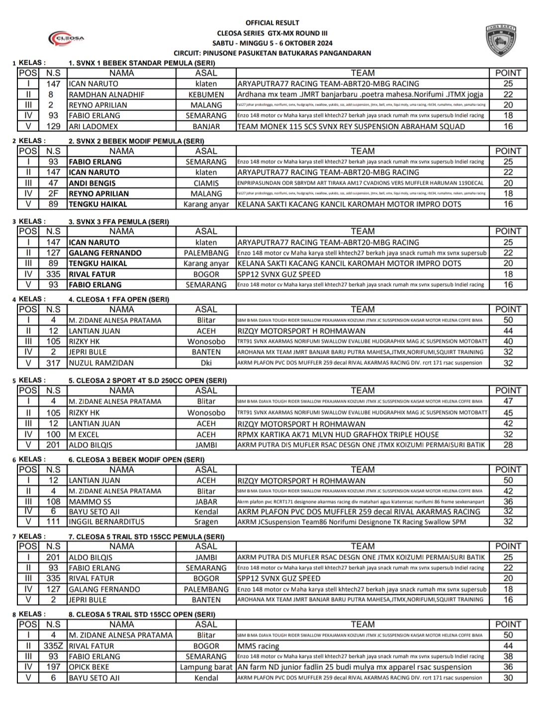 OtomotifZone.com – Pangandaran. Berikut hasil Cleosa Series Round 3 yang berlangsung Sirkuit Pinusone, Pasuketan, Desa Batukaras, Kec Cijulang, Kab Pangandaran Jawa Barat 5-6 Oktober 2024.