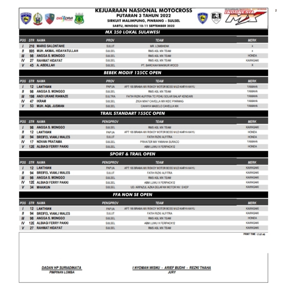 Racing Roda 2MotocrossRace Results Hasil Seri 3 Kejurnas Motocross Pinrang 2022 Penulis Hafid Hapid - 11 September 2022 0 353 FacebookXPinterestWhatsApp OtomotifZone.com-Pinrang. Berikut hasil Seri 3 Kejurnas Motocross sirkuit Malimpung, Pinrang, Sulawesi Selatan 10-11 September 2022.