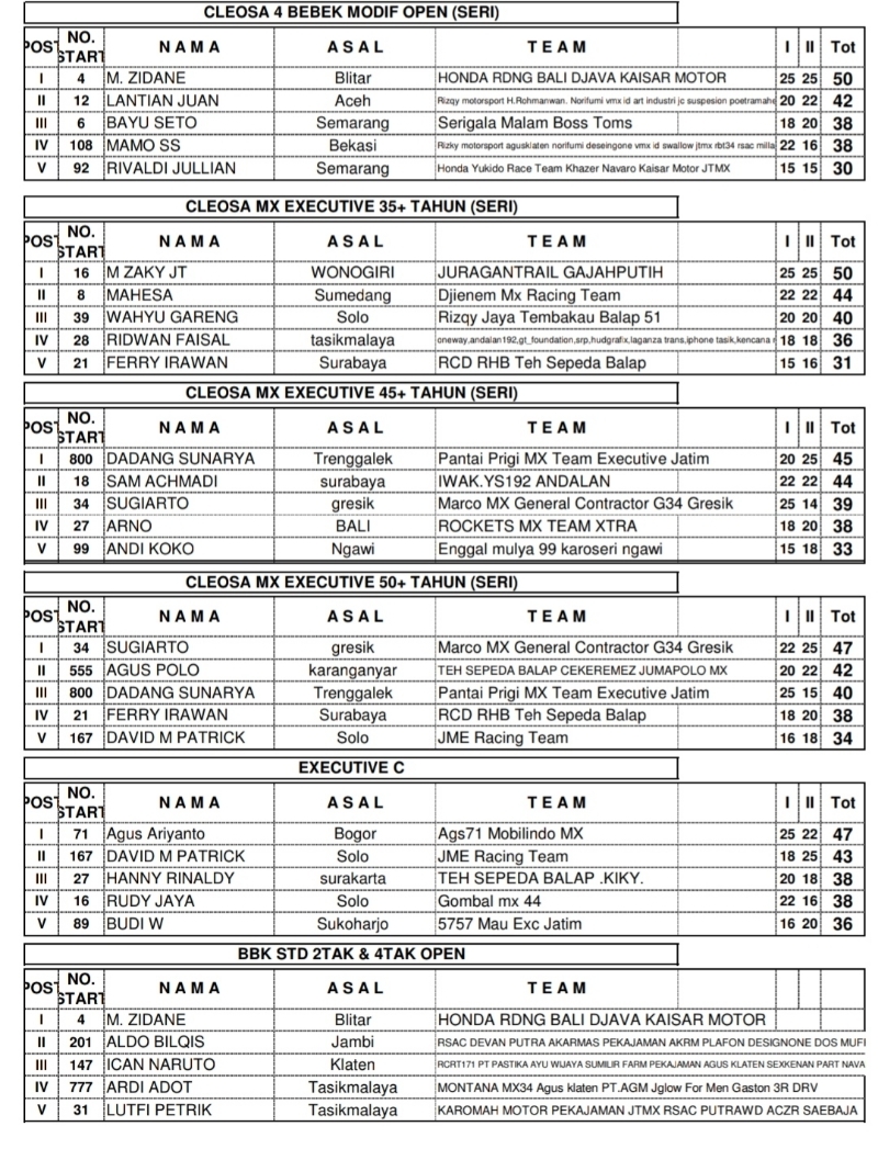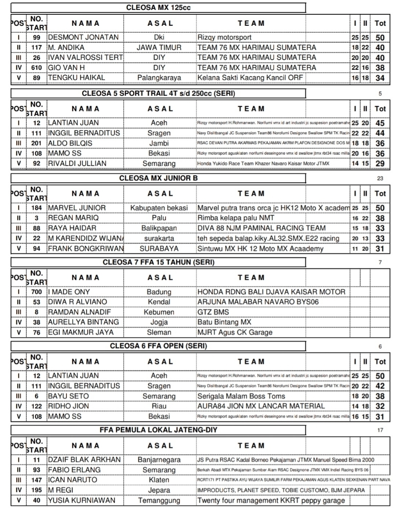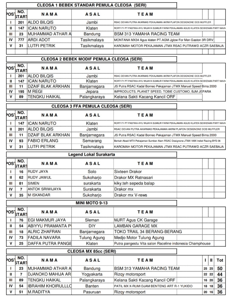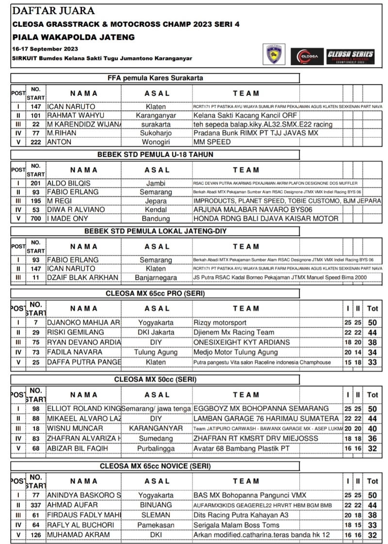 OtomotifZone.com-Karanganyar. Seri 4 Cleosa Grasstrack Motocross Sirkuit Kelana Sakti, Jumantono, Kabupaten Karanganyar hari pertama 16-17 September 2023 selesai dilaksanakan. Adapun hasil balapnya sebagai berikut..