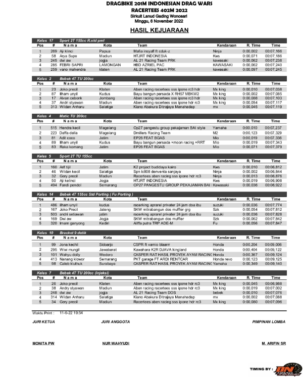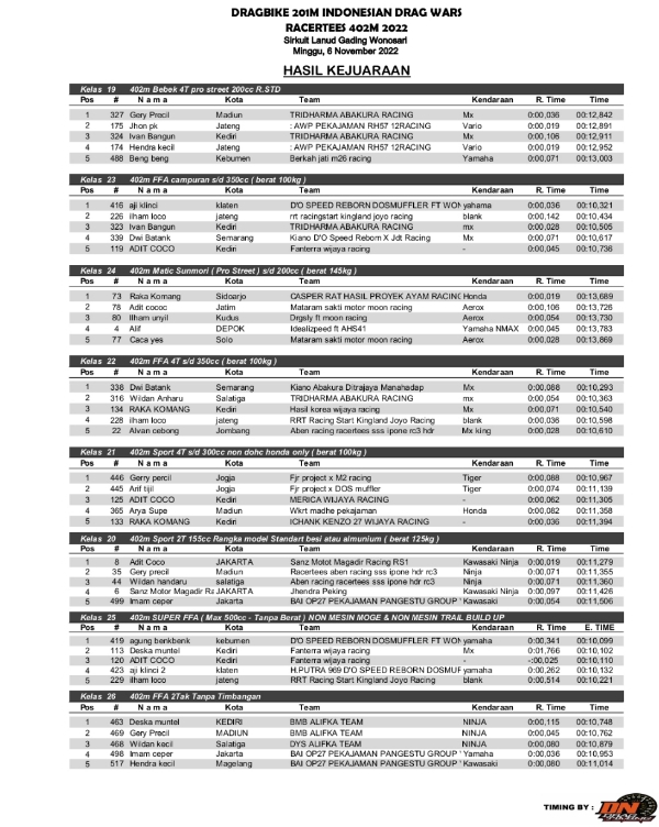 Racing Roda 2Drag BikeRace Results Hasil Seri 4 IDW Lanud Gading Gunung Kidul 2022 Penulis Hafid Hapid - 8 November 2022 0 463 FacebookXPinterestWhatsApp OtomotifZone.com-Gunung Kidul. Berikut hasil race Seri 4 Indonesia Drag Wars sirkuit Lanud Gading, Gunung Kidul, Jogjakarta 6 November 2022. Penulis : Hafid | Foto : Hafid