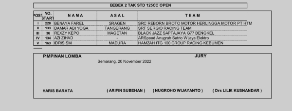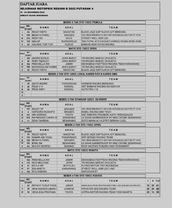 Race ResultsRacing Roda 2Road Race Hasil Seri 4 Kejurnas Motoprix Mijen Semarang 2022 Penulis Hafid Hapid - 20 November 2022 0 348 FacebookXPinterestWhatsApp OtomotifZone.com-Semarang. Berikut hasil race dari Seri 4 Kejurnas Motoprix di sirkuit Mijen, Semarang 19-20 November 2022. Penulis : Hafid | Foto : Hafid