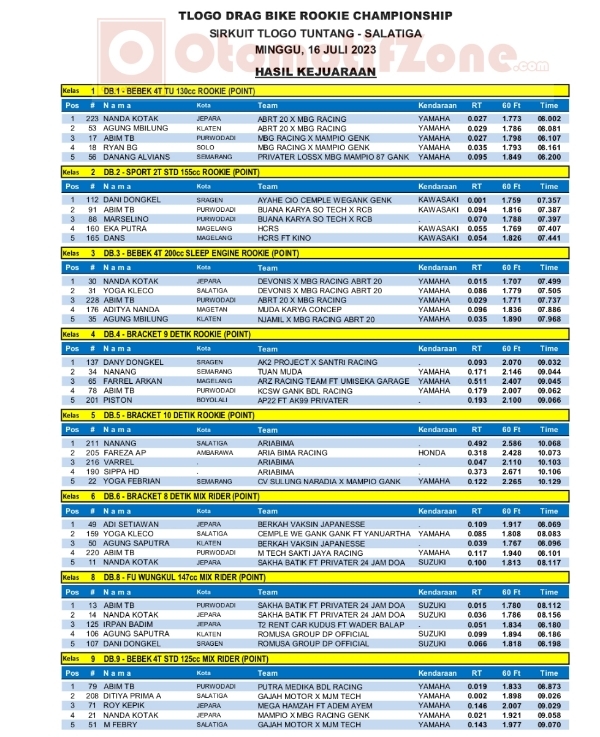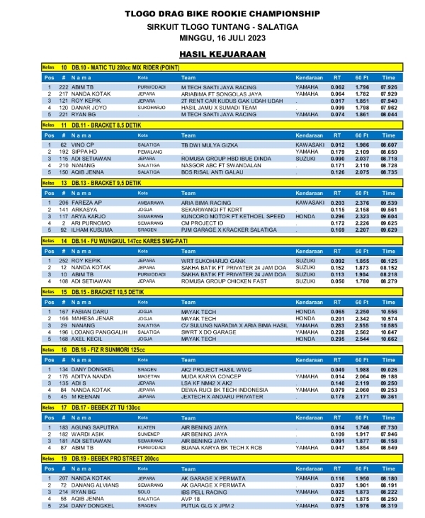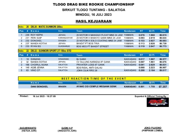 OtomotifZone.com-Semarang. Gelaran perdana series dari Tlogo Drag Bike Rookie Championship sirkuit Tlogo, Tuntang, Semarang 16 Juli 2023 selesai dengan hasil positif. Setelah beberapa event uji coba mampu menyedot peserta pemula baru wilayah Semarang dan sekitarnya. Event ini siap melanjutkan jadwalnya bulan depan. Dan berikutĀ hasil race yang sudah kami terima..