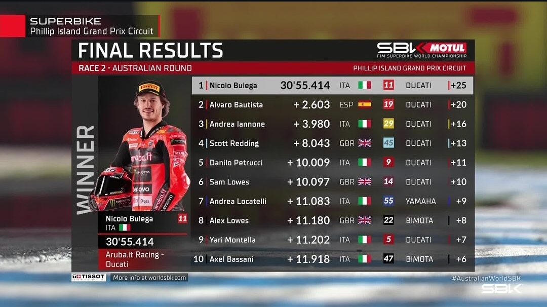 OtomotifZone.com – Philips Island. Duet Nicolo Bulega X Ducati benar – benar bukan main, tiga balapan seri perdama WSBK yang dilakoni, semua dibabat habis oleh Bulega dengan berhasil meraih podium pertama. Kemenangan besar juga bagi Ducati dimana semua pedium juga disikat habis.