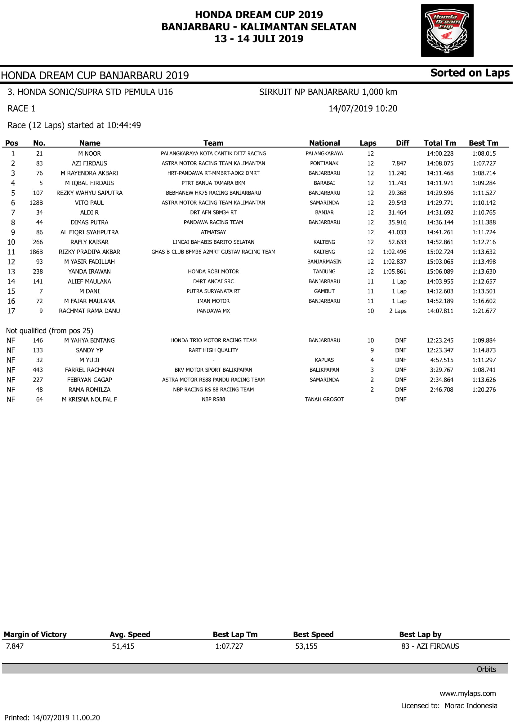 OtomotifZone.com – Banjarbaru. Pembalap tim Palayangkara Kota Cantik DITZ Racing, M Noor sukses melenggang menjadi juara di kelas Hona Sonic/Supra STD Pemula U16 (HDC3) dalam ajang Honda Dream Cup 2019 Banjarbaru yang dilaksanakan di sirkuit NP Murjani, Banjarbaru, Kalsel, Minggu (14/7). Mengawali start dari posisi kedua, membuat langkah M Noor untuk leading di urutan pertama semakin mudah.