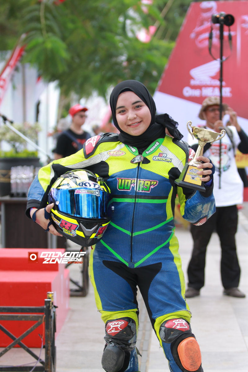 ” Tentunya saya sangat bahagia bisa meraih juara dan semoga kedepanya saya bisa trus meningkatkan skil serta menambah jam terbang. Saya juga memohon dan berharap penyelengara terus memperhatikan kami dengan terus membuka kelas Matik khusus Wanita agar hoby kami bisa tersalurkan ” Jelas Putri Cekka kepada penulis setelah podium ceremony